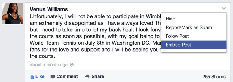 Embedded posts only works on statuses that are public. To access it, click on the globe icon next to the status and select “Embed Post” in the drop down menu. You’ll be given a code whereby you can copy and paste into your website. All liking and sharing can be done directly on the embedded posts, however, if you wish to comment, you will be redirected to the post itself.