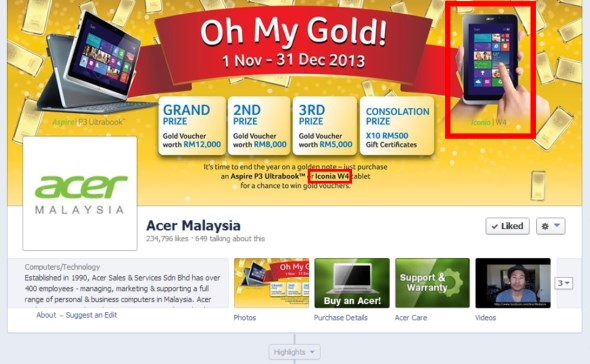 Called Oh My Gold!, the contest apparently provides the opportunity for buyers of selected Acer products to win RM 25,000 worth of gold and the Iconia W4 is listed as one of such products. Furthermore, the 8-inch Windows 8.1 tablet which is powered by the new Bay Trail-based 1.33GHz Intel Atom Z3740 quad-core processor has appeared on the contest’s website and Acer Malaysia’s recent catalogue which listed it for RM 1,199 with 64GB internal memory and 2GB RAM.