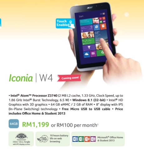 While there is no proper announcement by Acer Malaysia at the time being, it seems that Acer Iconia W4 tablet is pretty much confirmed for release into our market very soon. This fact came through the announcement of Acer Malaysia’s latest contest on their Facebook page few days ago.