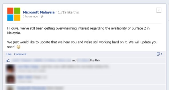 In a brief post on their Facebook page (shown below), Microsoft Malaysia earlier today pointed out that they are aware of the overwhelming interests from users regarding Surface 2. Hence, they working on making it happen and will provide a status update on the device soon.