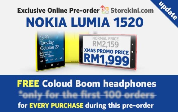 As you might know, Lowyat.NET’s own Storekini is one of the official retailers that provides pre-order program for the brand new Nokia Lumia 1520. During the initial announcement, we have mentioned that the first 100 pre-order customers will receive a Coloud Boom Headphone WH-530 as a gift but things have now changed though.