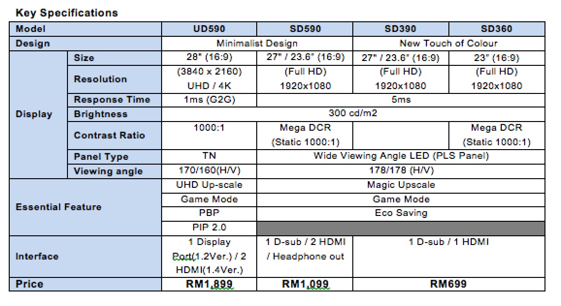 Back when we did our April Fool’s Day site revamp, Samsung had announced their new computer monitor offerings but in a true crowdsourcing way, it wasn’t exactly the best coverage. Today those monitors are making their way to Malaysia and at the price, its a pretty decent offering too! Alongside the UD590 28inch 4K display with a billion colours, Samsung are also bringing the SD590, SD390 and SD360 as well. Coming in at RM699 for the SD360 and SD390 models, RM1099 for the SD590 and RM1,899 for the 4K UD590.