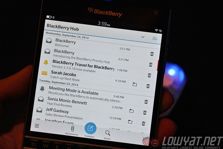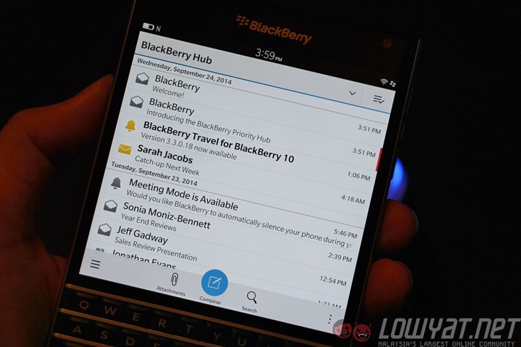 But, once you get used to the location of the keys, the typing experience gets somewhat smoother. What I really like about the Passport’s keyboard are the word prediction engine, which even from the start was able to have a good grasp of what I was going to type next – I’m pretty sure it’s not because I’m a predictable person. And it’s so easy to insert a prediction: a swipe up beneath the three word suggestions (located on the left, middle and right side of the bottom half of the screen) from your keyboard inserts that prediction. Made a typo? One swipe to the left from your keyboard removes the current word.