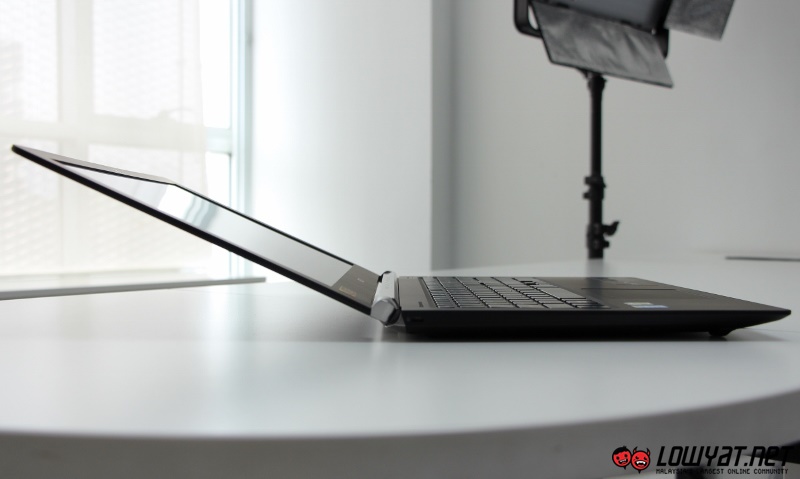 With a maximum thickness of 23.9mm, the laptop itself is not too heavy at around 2.4kg. In terms of design, one of the first thing that one would notice on the laptop is its lid which features texturized vertical patterns. The laptop is almost fully draped with soft touch, rubber-like material with the exception of the hinge area which is coloured in silver.