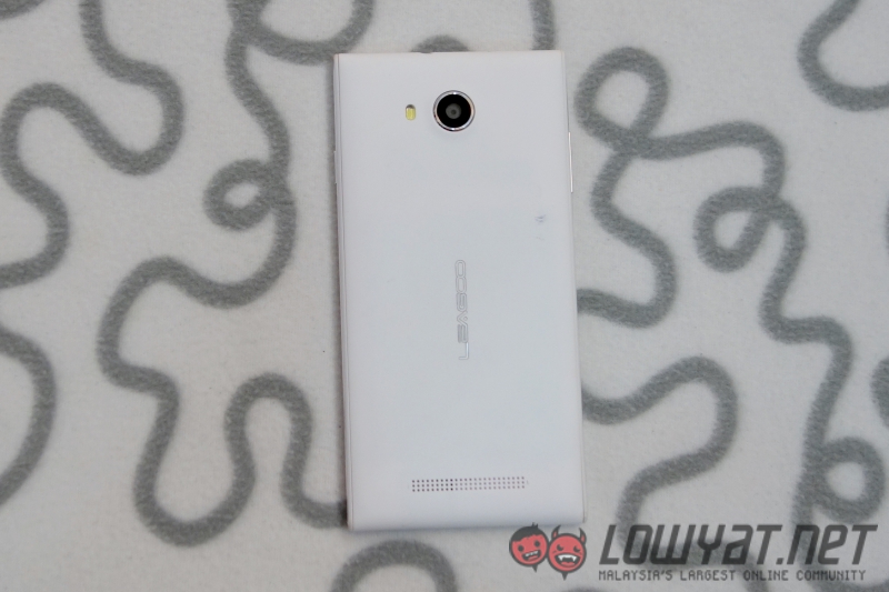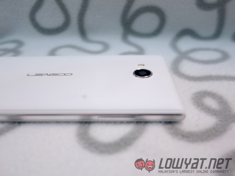 The front of the device is dominated by the large 5” display and right below that is the capacitive buttons. The back has a slightly protruded 5MP rear camera paired with an LED flash, a shiny Leagoo logo, and a speaker grille right at the bottom.