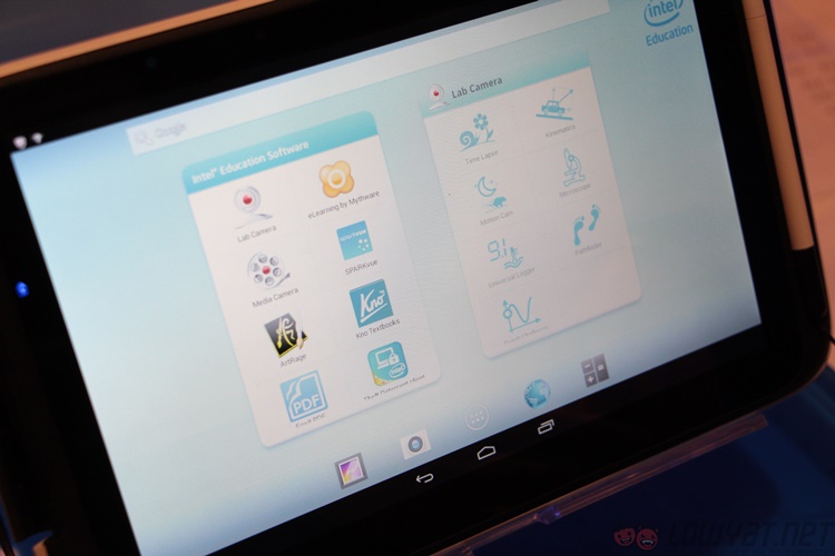 Intel did not share the internals of the device, or any real specifications for that matter; The tablet appears to run on a customised version of Android, while the 2-in-1 is a Windows 8 based system. Instead, representatives chose to highlight the potential applications of the design. Fitted to the reference tablet was a thermometer and microscope attachment for use in science lessons.