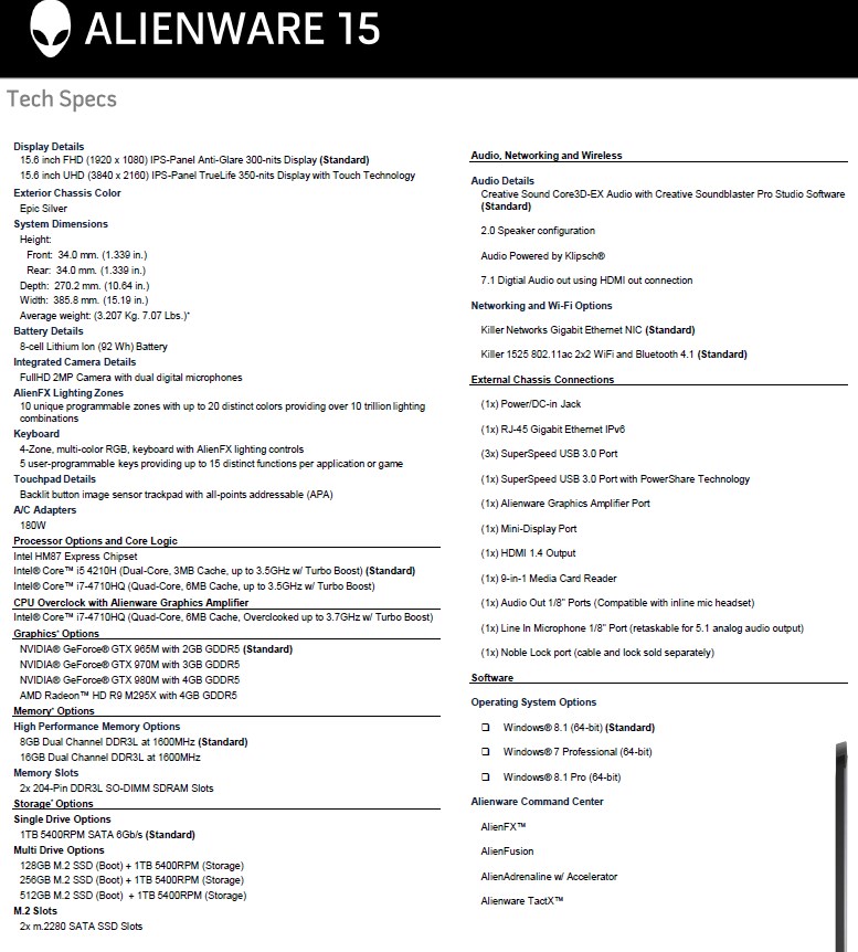 While they are still stuck with 4th generation Intel Core i5 and Core i7 processors at the moment, customers are able to choose the latest GPUs from AMD and NVIDIA for Alienware 15 and 17. As a standard, the Alienware 15 is equipped with NVIDIA GeForce GTX 965M (aha!) while Alienware 17’s standard GPU option is NVIDIA GeForce GTX 970M.