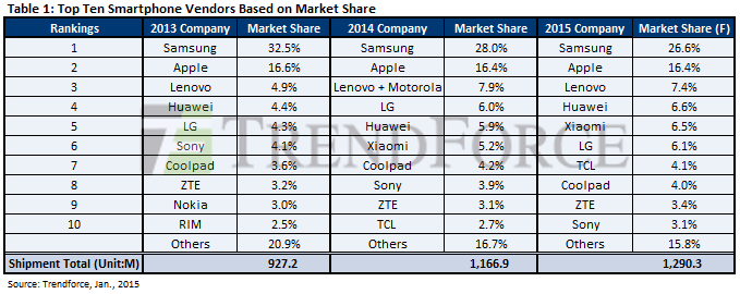 Individually, the market share for Samsung fell from 32.5% to 28.% year-on-year, and is forecasted to continue falling for 2015. Apple on the other hand managed to retain its spot pretty well, dropping only a tiny bit from 16.6% in 2013 to 16.4% in 2014, and is expected to maintain this number for 2015. So who’s been eating into Samsung’s piece of the pie? TrendForce says that the high-end Galaxy Note series faced stiff competition from the iPhone 6 Plus, while its mid-range and low-end phones were undercut by Chinese brands.