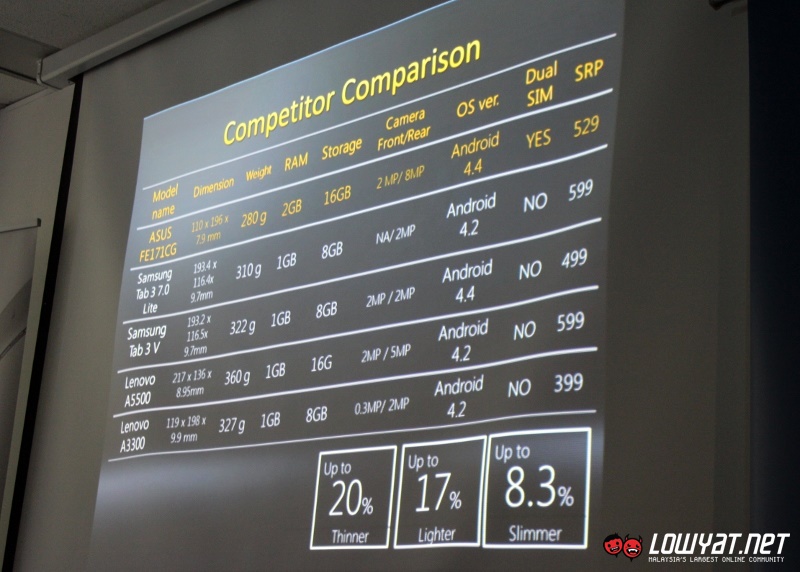 However, the FE171CG is powered by the same processor as per FE170CG though which is the 1.2 GHz Intel Atom Z2520 dual-core Hyper-Threading processor. Additionally, both are them also feature dual-SIM dual-standby and telephony capabilities. Scheduled for release at all ASUS retailers throughout the country starting from early February, the Fonepad 7 FE171CG will be priced at RM 529.