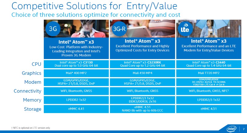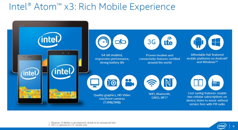 The Atom x3 is the odd one out of the trio, not only because it intended for the lower end market; but also because it is not made by Intel. Manufacturing is done by TSMC as Intel thinks it is not cost efficient to build its own chips with integrated modems into its 14-nm node. For this reason as well, the Atom x3 is made using a 28nm process; which essentially makes it a rebranded Intel SoFIA which was revealed at last year’s Computex.