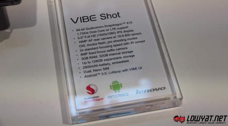 Pre-installed with Lenovo’s own VIBE UI on top of its Android 5.0 operating system, users are able to expand Vibe Storge’s storage with microSD card of up to 128GB. The device is also able to support dual Nano SIM cards as well as LTE speed of up to 150Mbps for download and 50Mbps for upload. Last but not least, a non-removable 2900mAh battery provides the necessary juice to keep the Vibe Shot operational.