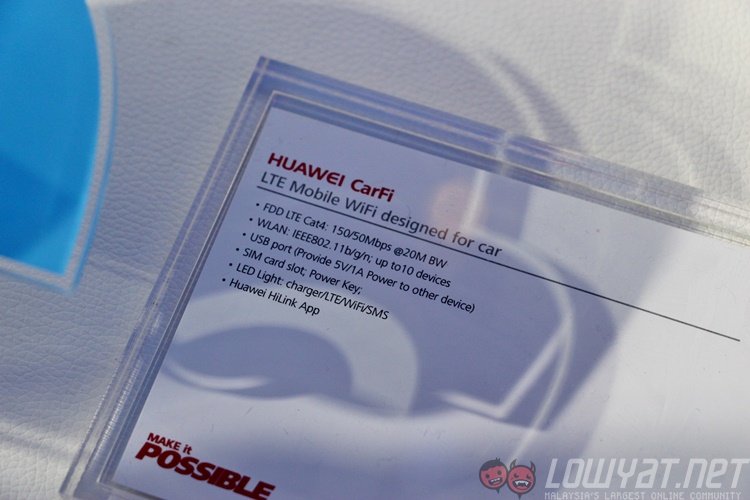 Finally, there’s Huawei’s CarFi, a unique 4G LTE mobile hotspot that plugs into a car’s power socket (or officially known as “cigarette lighter receptacle”). There’s a SIM card slot that supports LTE Cat 4 speeds, and the CarFi itself is made from fire-proof materials. Interestingly, there’s also a USB pass-through that allows users to charge their mobile devices while using the CarFi.