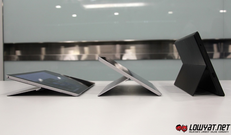 That being said, Surface 3 is equipped with a different kickstand than Surface Pro 3 which is limited to three pre-determined positions (shown below) as opposed to the latter’s free flowing kickstand that can be extended up to 150-degrees. Nevertheless, Surface 3 kickstand does extends slightly further than what the first and second generation of Surface tablets were able to do.