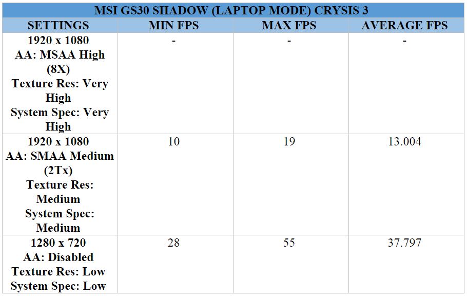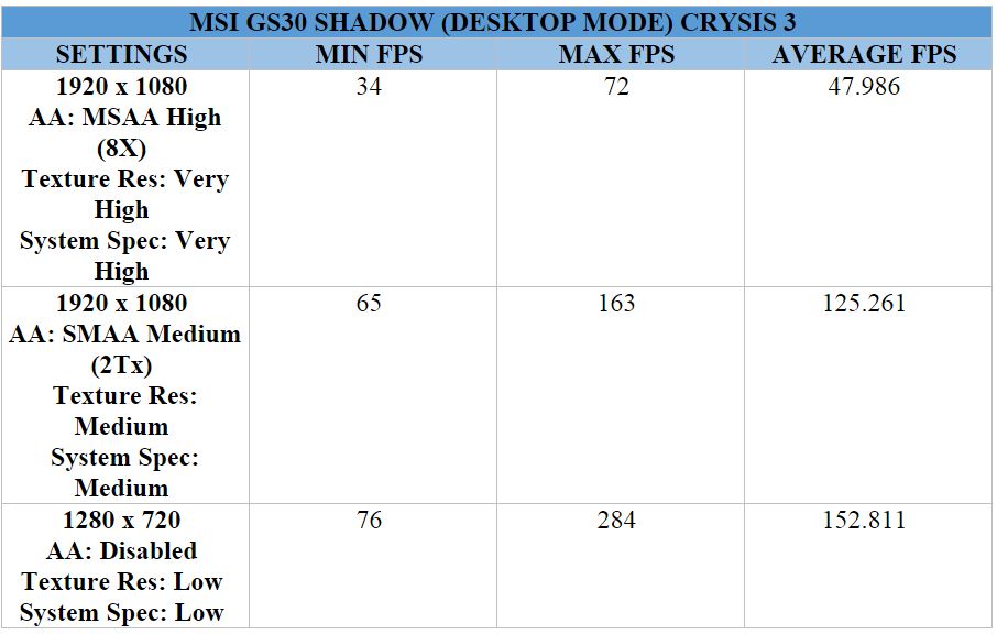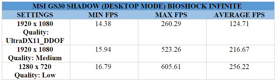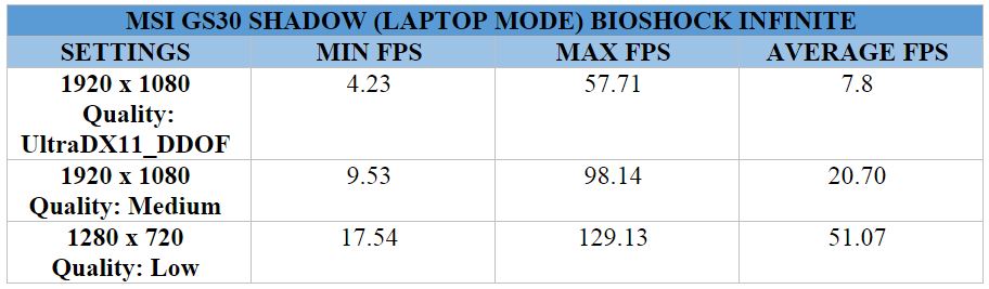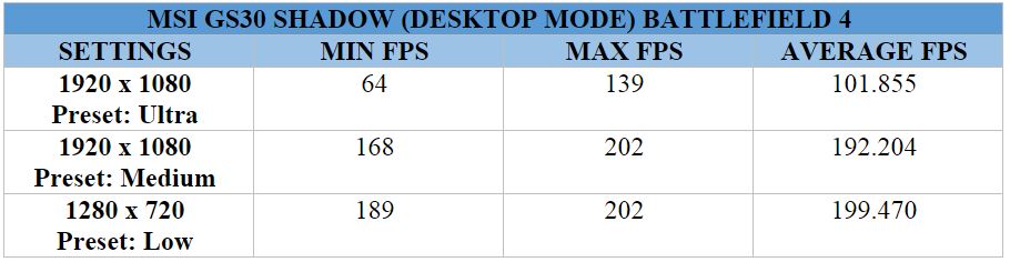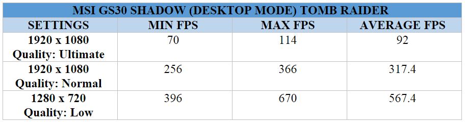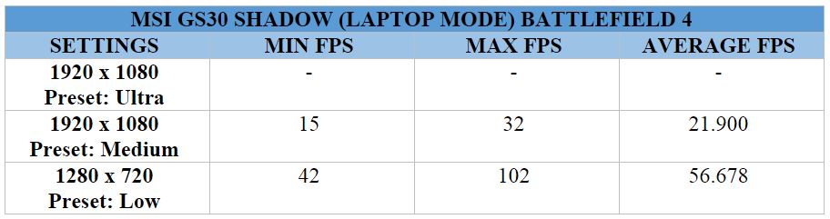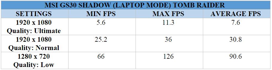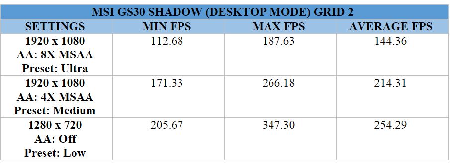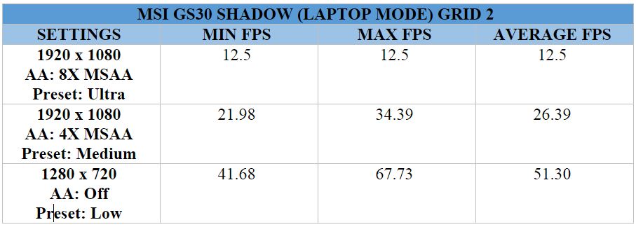 Based on these results, the Intel Iris Pro Graphics 5200 in the GS30 is pretty capable. At its lowest settings, all of the tested games are very playable at more than 30fps. At medium settings, however, the integrated graphics is clearly struggling, with only Tomb Raider and Grid 2 being somewhat playable.