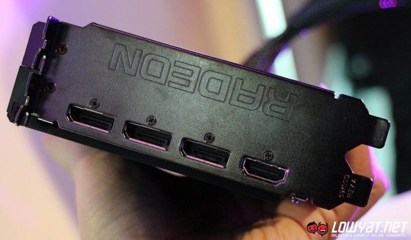 Not only that, there is also the red Radeon logo not far from the GPU Tach that would light up when the card is in operation and dual-BIOS switch that enables users to recover factory settings from the backup BIOS in case anything happened to the primary BIOS. Not to forget, R9 Fury X comes with three DisplayPort and one HDMI as its output ports and allows the card to support up to six monitors at the same time.