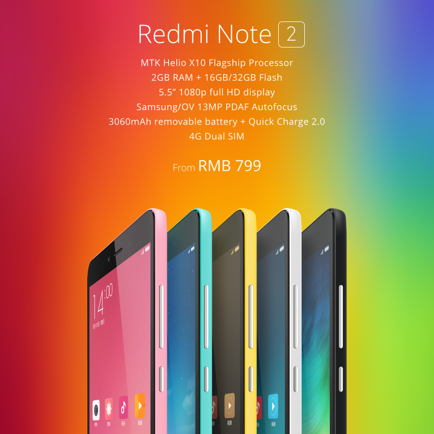 The Redmi Note 2 is available in five colours – white, black, pink, brown and light blue, and is available for 799 Yuan, about RM501 (Redmi Note 2 TDD LTE + TD SCDMA), 899 Yuan, about RM564 (Redmi Note 2 TDD LTE + FDD LTE), and 999 Yuan, about RM626 (Redmi Note Prime with 32GB storage).