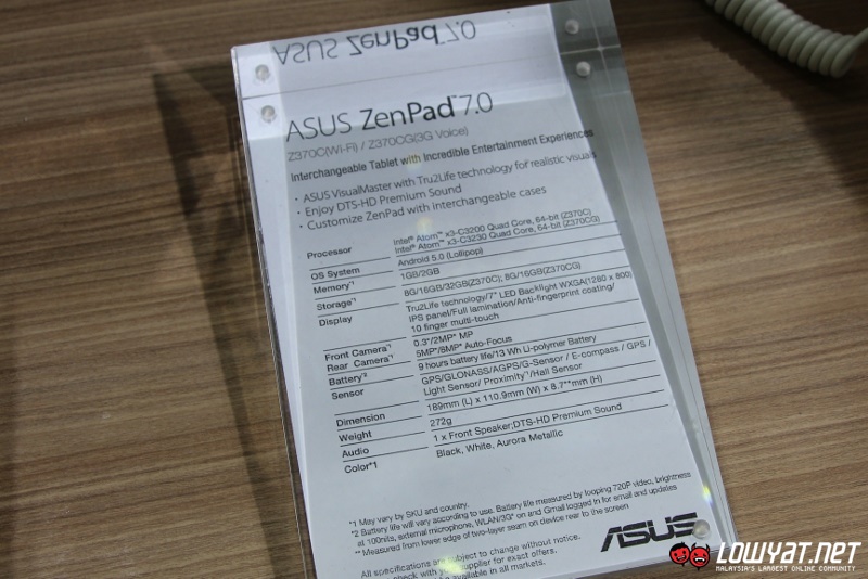 The ZenPad 7.0 also comes with DTS-HD Premium Sound and Sonic Master enhancement that work with the tablet’s own front speaker and the optional ASUS Audio Cover. With a thickness of 8.7 mm, the 272 grams tablet is also equipped with a 13 Whr battery that apparently able to deliver up to 8 to 9 hours of battery life.