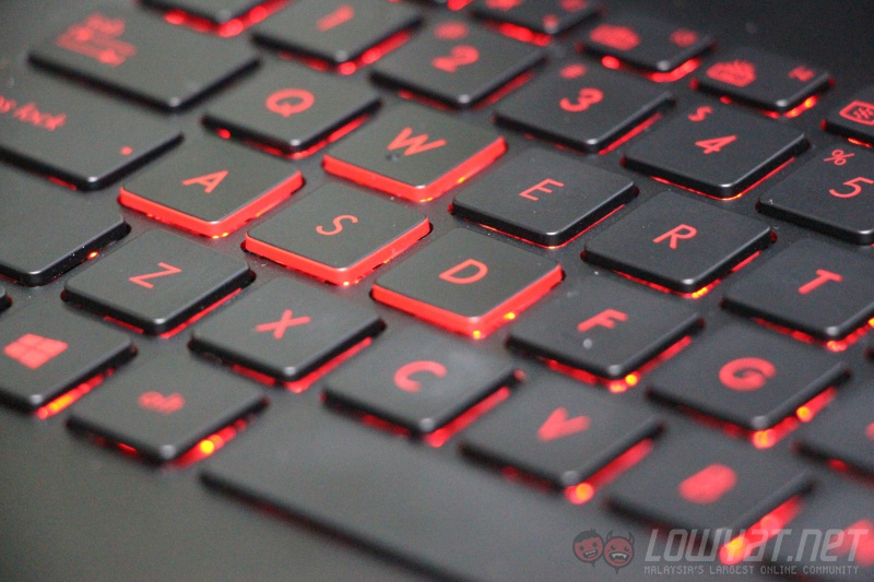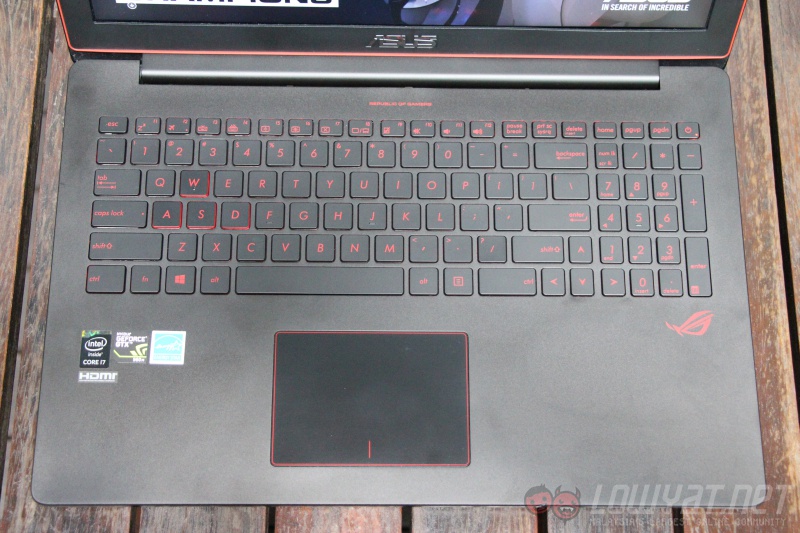 Once I lifted the lid (which can be done with only a single finger; very impressive), the red accents throughout the G501’s display, trackpad, and even WASD keys definitely give it a “gaming laptop vibe.” The ROG logo can also be seen on the bottom right of the red backlit keyboard.