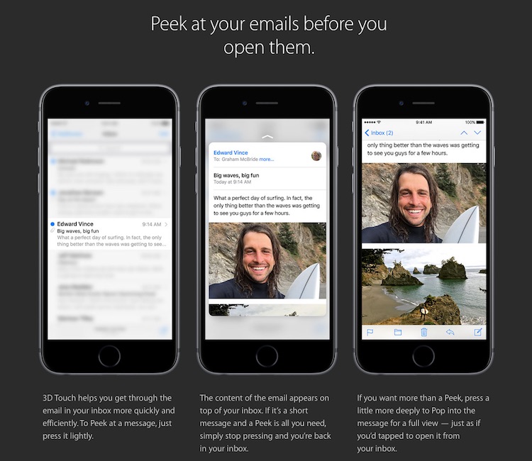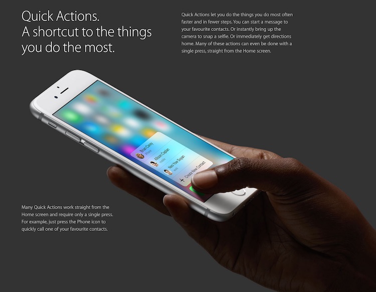 As anticipated, the display now also has a new Force Touch technology called 3D Touch. It can recognize different type of touches (using pressure-sensing technology), giving a whole new level of control. You can instantly see a response on the screen depending on the pressure you apply, and feel the feedback from an all-new Taptic Engine. Some of the things you can do with 3D Touch include: