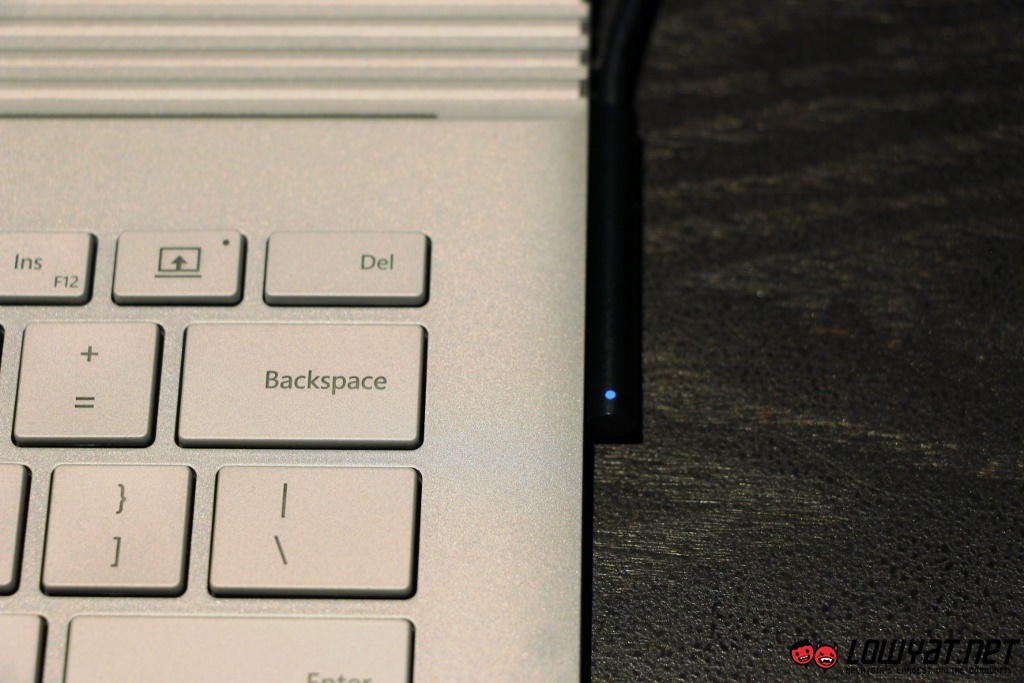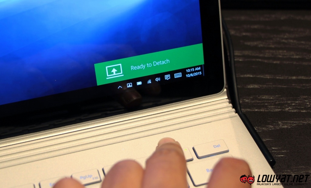 The Muscle Wire locks seem to be quite strong since users can actually dangle the device to a certain extent without separating its tablet and keyboard base. However, users can’t directly detach the Surface Book’s tablet from its keyboard as they need to press and hold the dedicated detach button on the keyboard first until the indicator light on the keyboard turns green in order disengage the Muscle Wire lock.