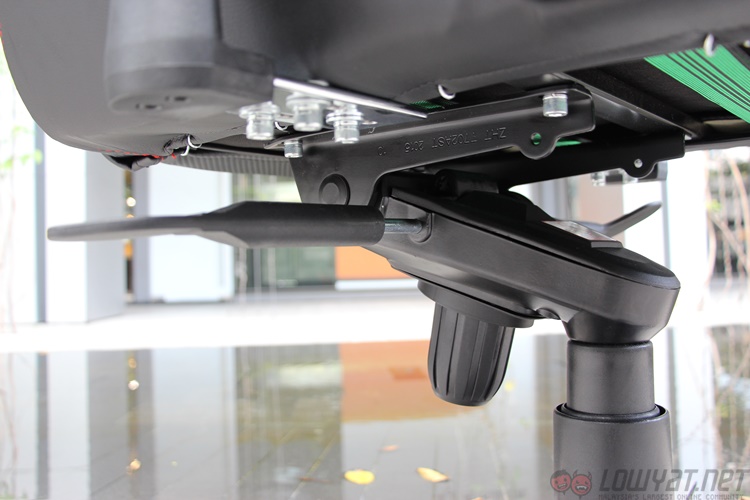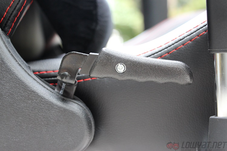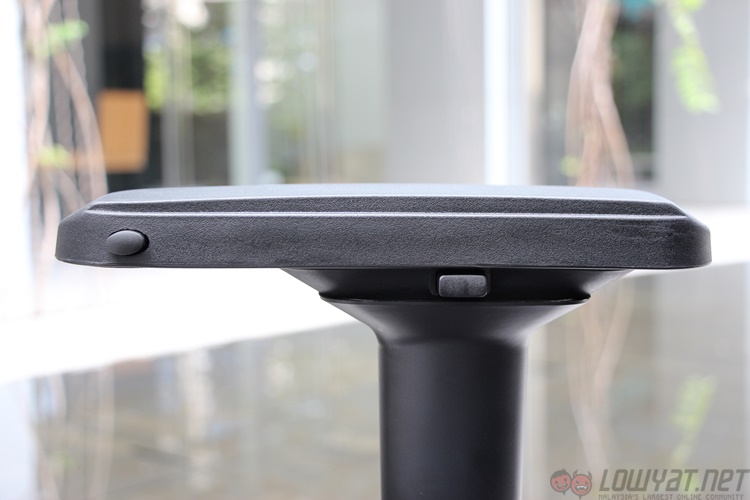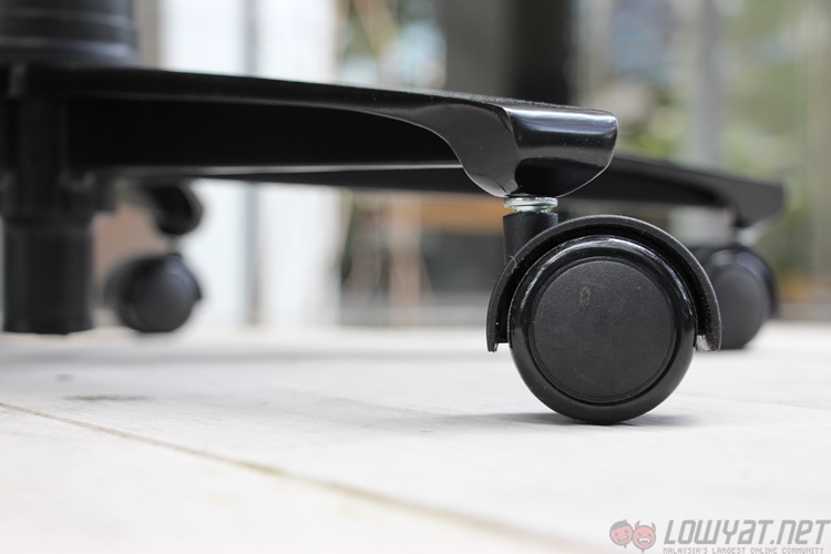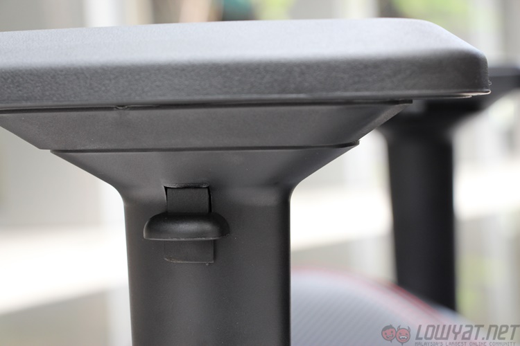 The arm rests resemble something off an office chair, with the thick plastic standing atop a steel post. The rests themselves can be adjusted in three directions, and lock into place with a series of tabs and buttons. Interestingly, the arms cannot be angled diagonally; this looks more like a result of the oval shape of the post more than anything else. The top of the arm rests contain a soft plastic and isn’t quite as solid as it looks. Which is a nice touch.