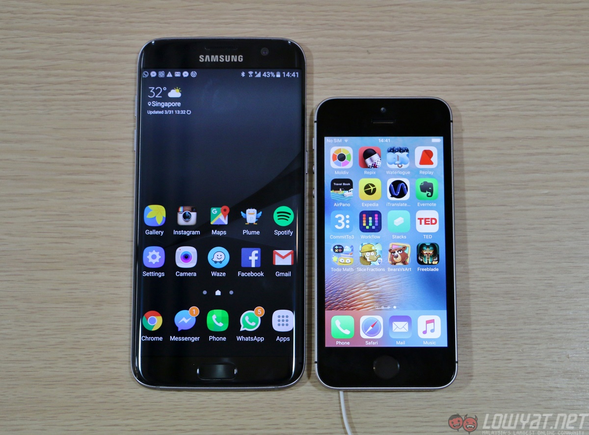 When placed side by side with the current-gen iPhones, the iPhone SE makes the iPhone 6s look large, and the 6s Plus gigantic in comparison. Even with the Samsung Galaxy S7 edge and its tiny footprint looks chunky when placed next to the SE.