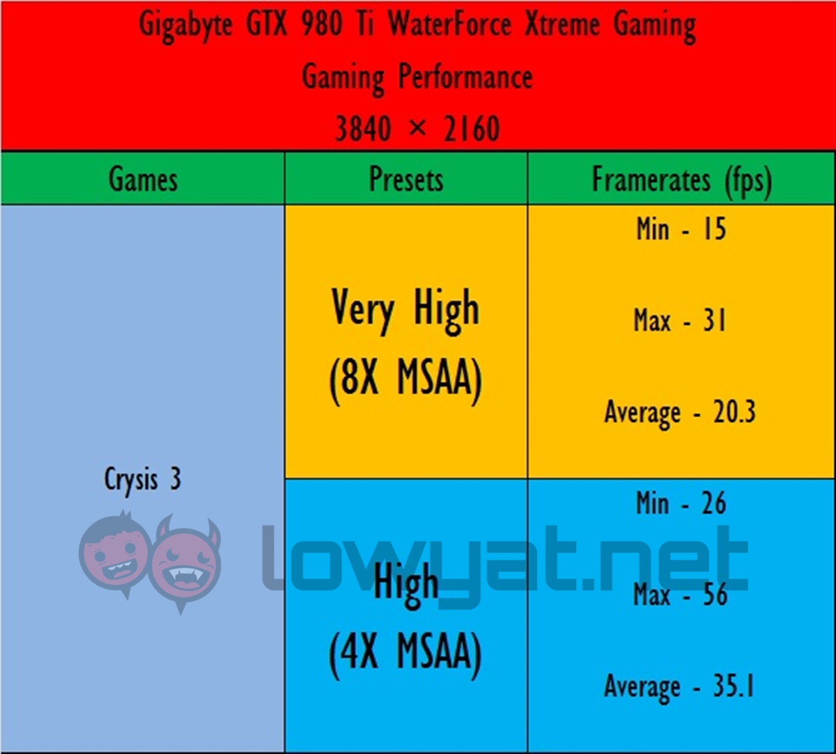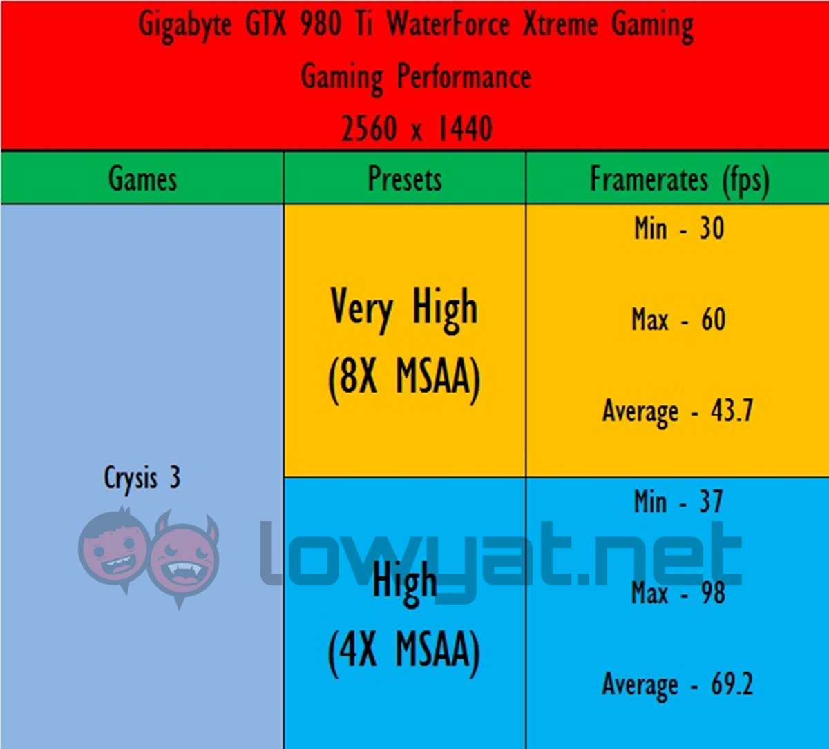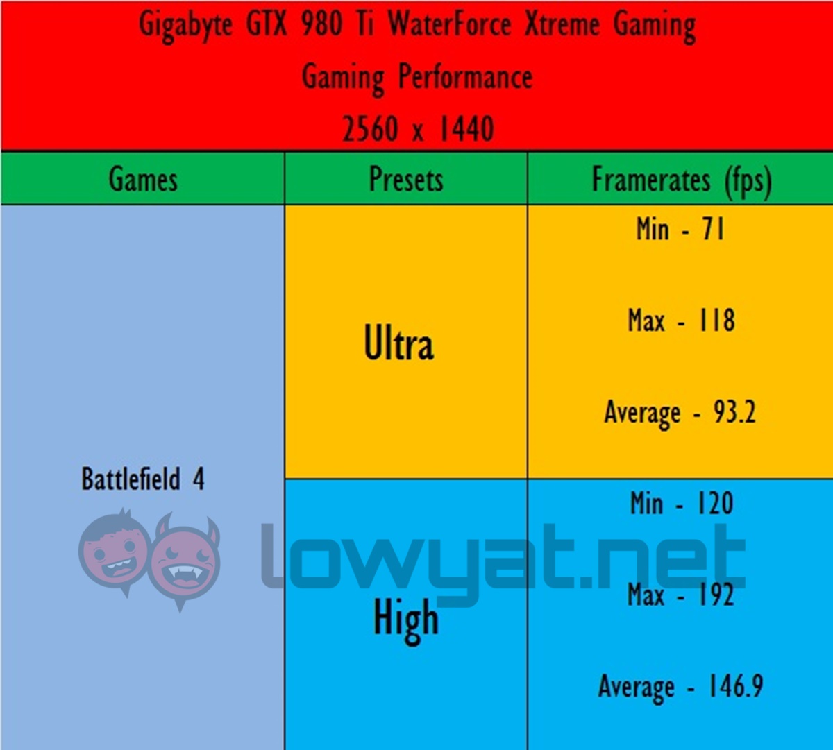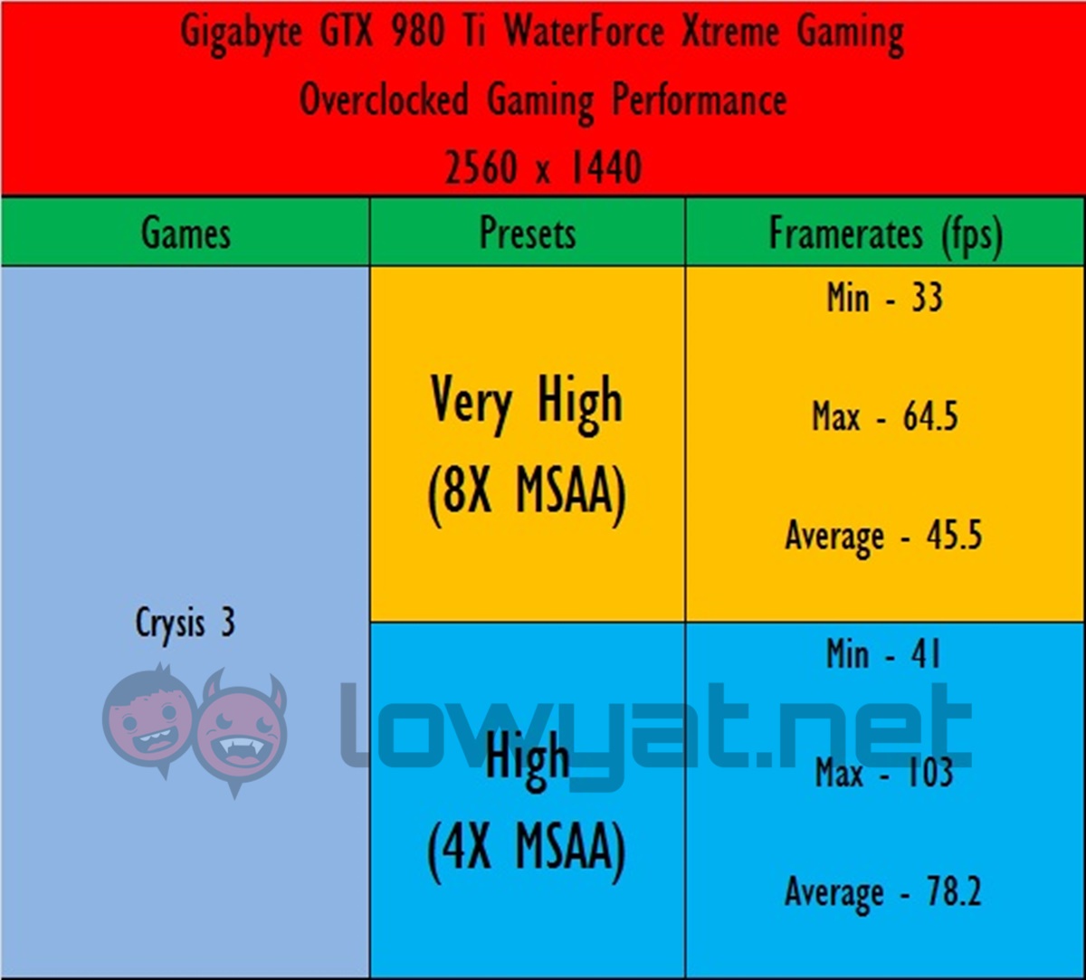 Without overclocking the Gigabyte GTX 980 Ti Xtreme Gaming WaterForce, the graphics card was able to churn out above 30fps for all games running at a 4K resolution; Crysis 3 being the only exception. When playing games at 1440p resolution, the graphics card was able to deliver, on average, above 80fps for almost all games.