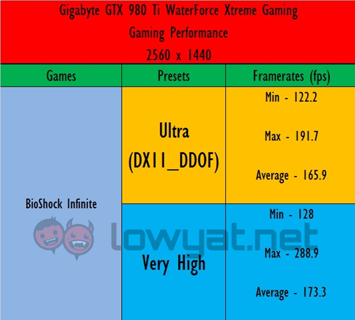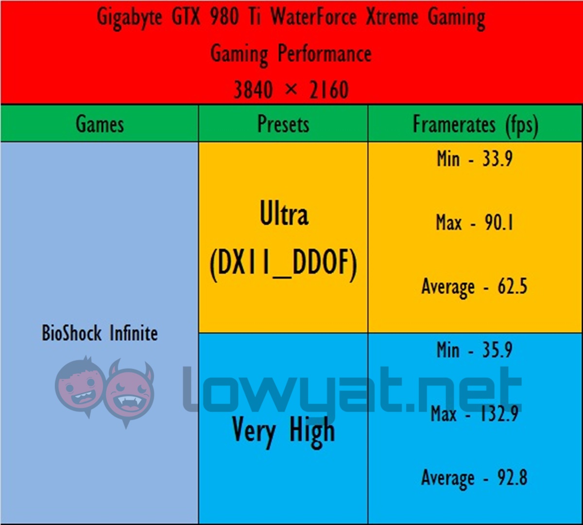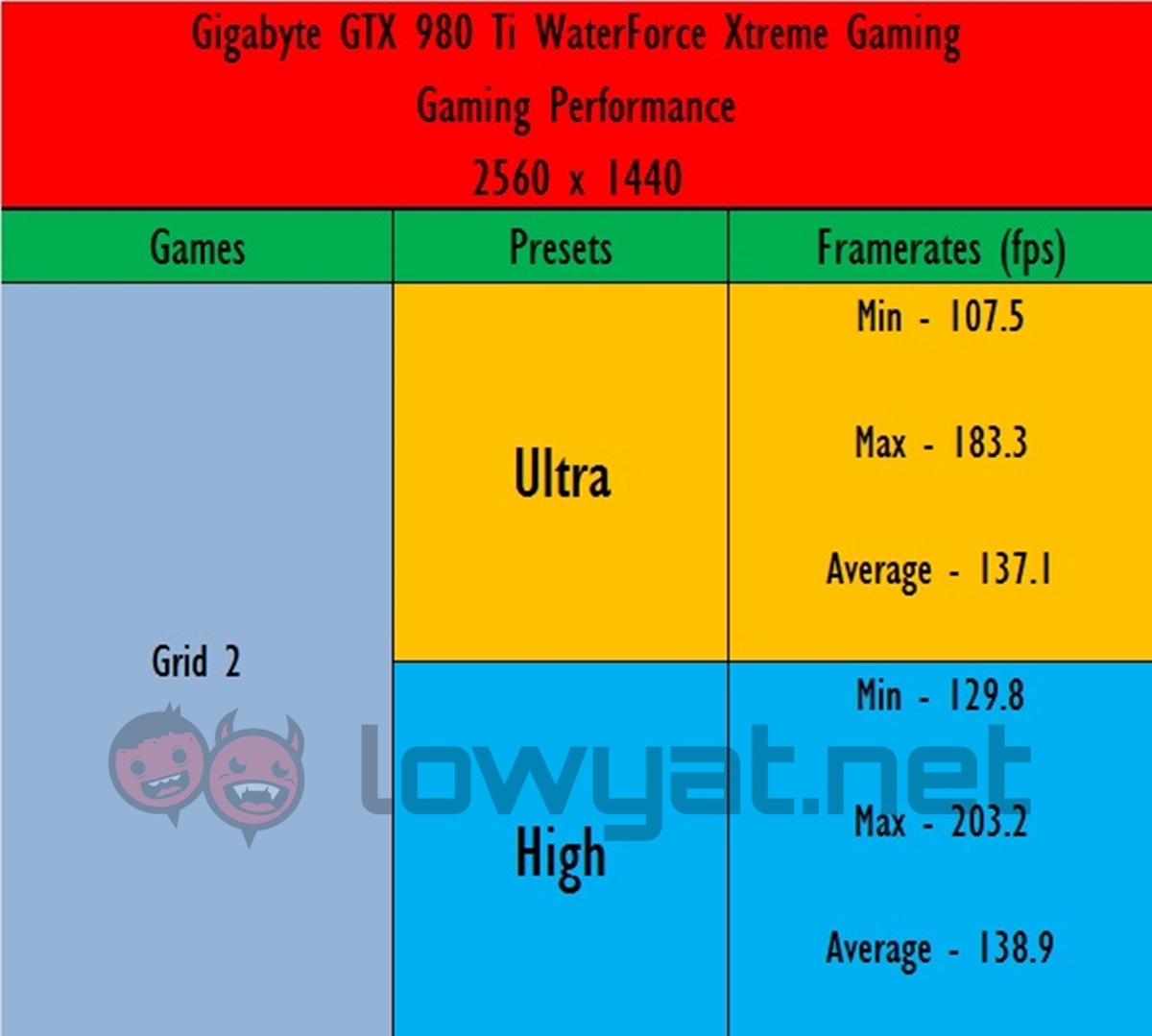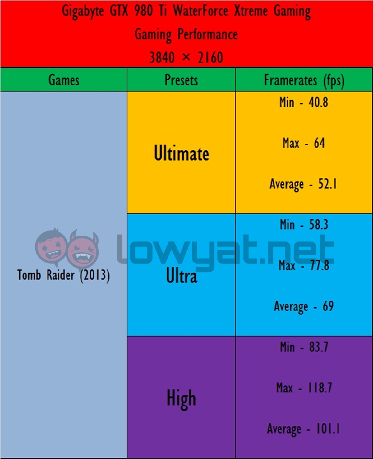 Without overclocking the Gigabyte GTX 980 Ti Xtreme Gaming WaterForce, the graphics card was able to churn out above 30fps for all games running at a 4K resolution; Crysis 3 being the only exception. When playing games at 1440p resolution, the graphics card was able to deliver, on average, above 80fps for almost all games.