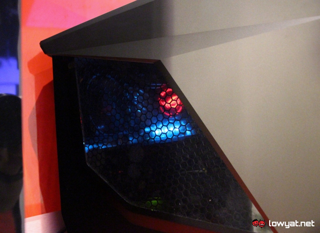 Given how ASUS portrays ROG with an aggressive image in order to match the high performance nature of ROG products, that same idea has certainly influenced the exterior design of GT51. The circular area on the bottom front of GT51 which looked like Iron Man’s arc reactor is not just for show – it actually acts as the air intake for the system and houses a fan that help sucks in air to cool down GT51’s internal hardware.
