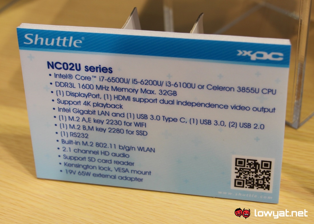 With the ability to support up to 32GB of DDR3L 1600MHz memory as well as 4K playback, the NC02U comes with quite a number of I/O port including a USB 3.0 Type-A, USB 3.0 Type-C, USB 2.0, Ethernet, HDMI, and DisplayPort. It also comes standard with M.2-based 802.11 b/g/n wireless LAN.