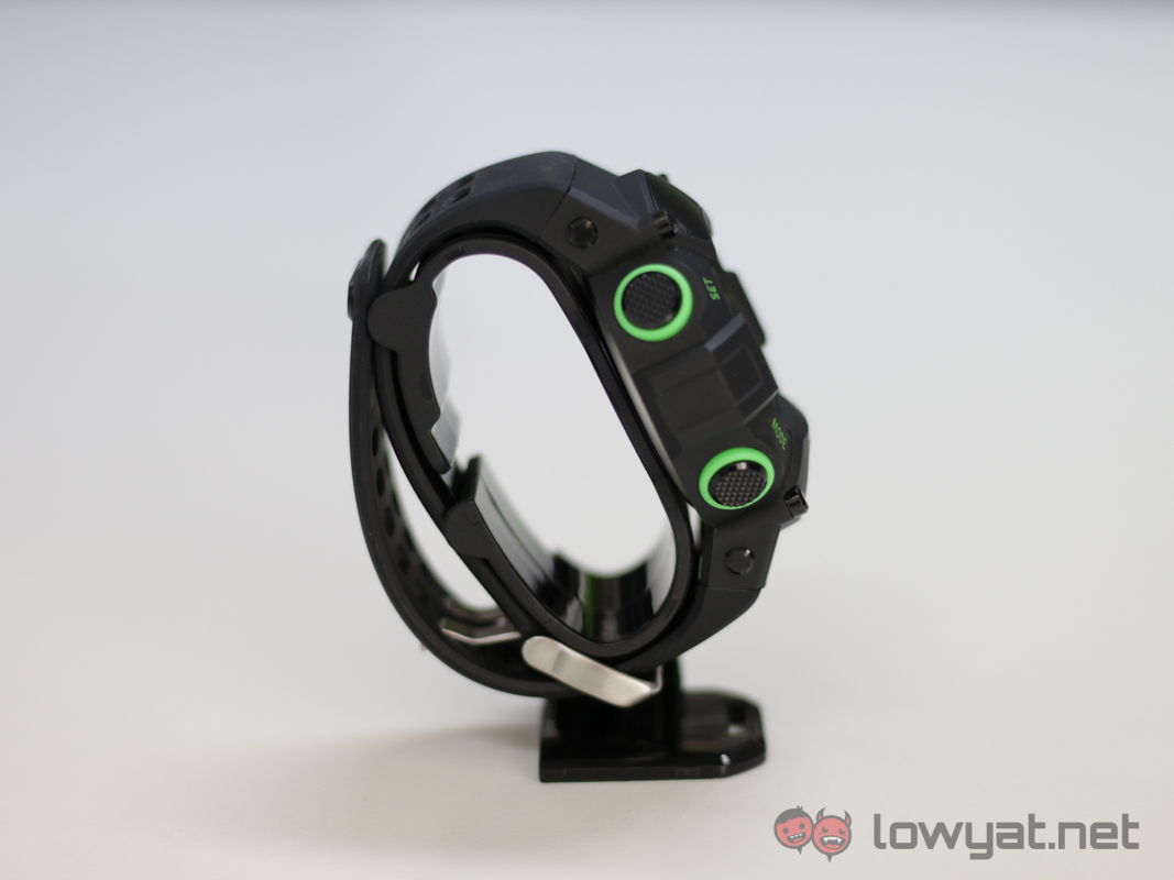 Dominating most of the design is the G-Shock style digital watch. Complete with huge bezel and oversized buttons. The watchface itself is reminiscent of the old G-Shock; aside from the addition of a secondary (tertiary?) LCD display just below the time display.