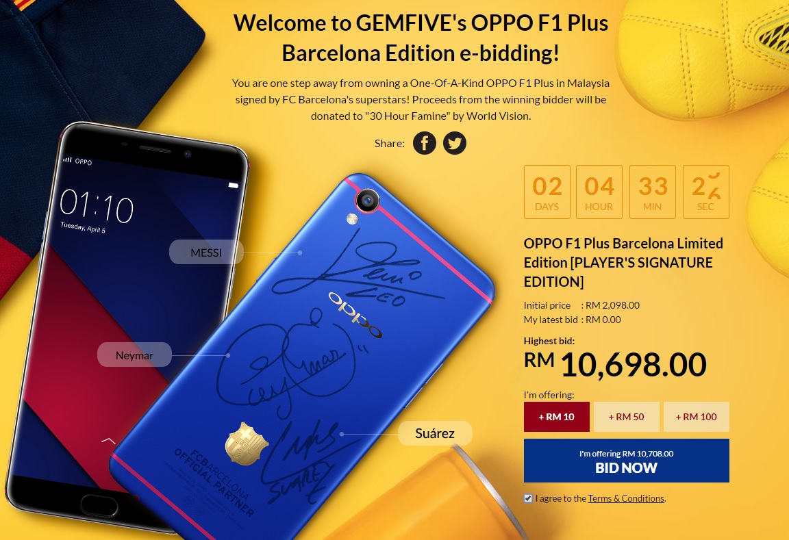 Bidding for the Oppo F1 Plus Barcelona Edition starts today, and will end on 20 July. At the time of writing, the highest bid has now surpassed RM10,000. With two days to go, we’re sure this figure will go even higher.