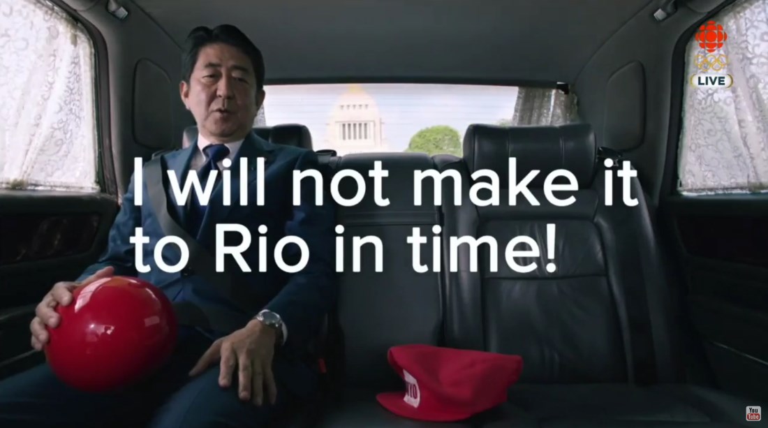 In the montage, Prime Minister of Japan, Shinzo Abe transforms himself into the famed video games character in order to reach Rio 2016 closing ceremony in time. This is done with the help of gadgetry expertise by another Japanese icon, Doraemon.