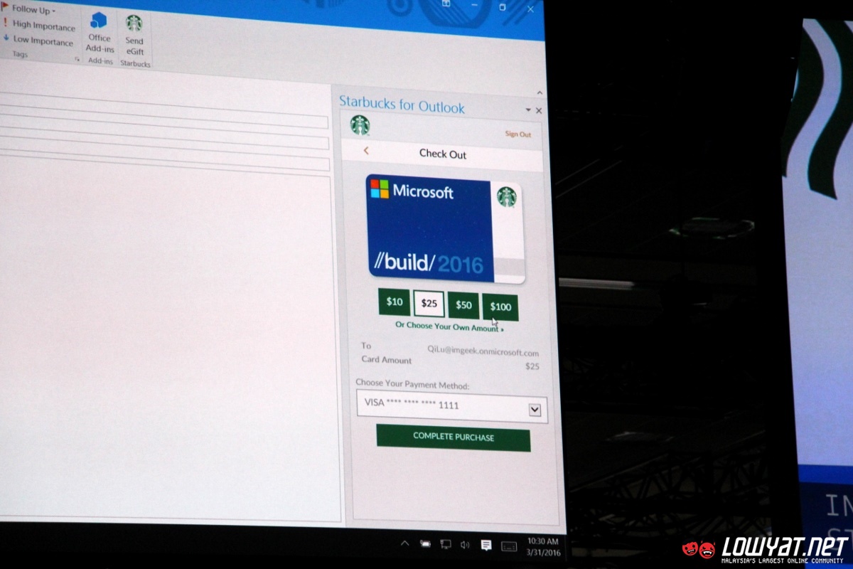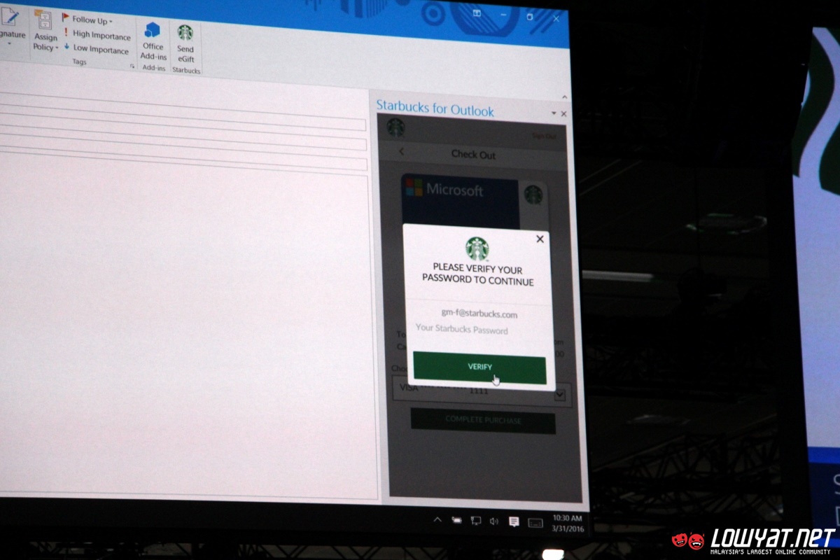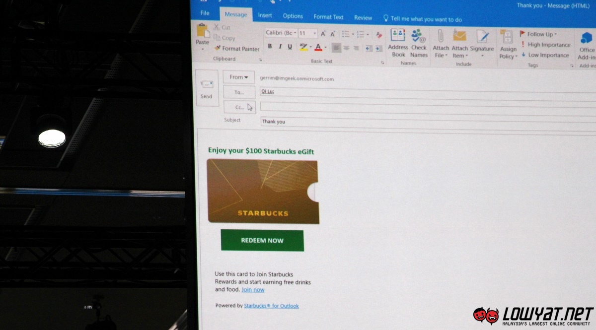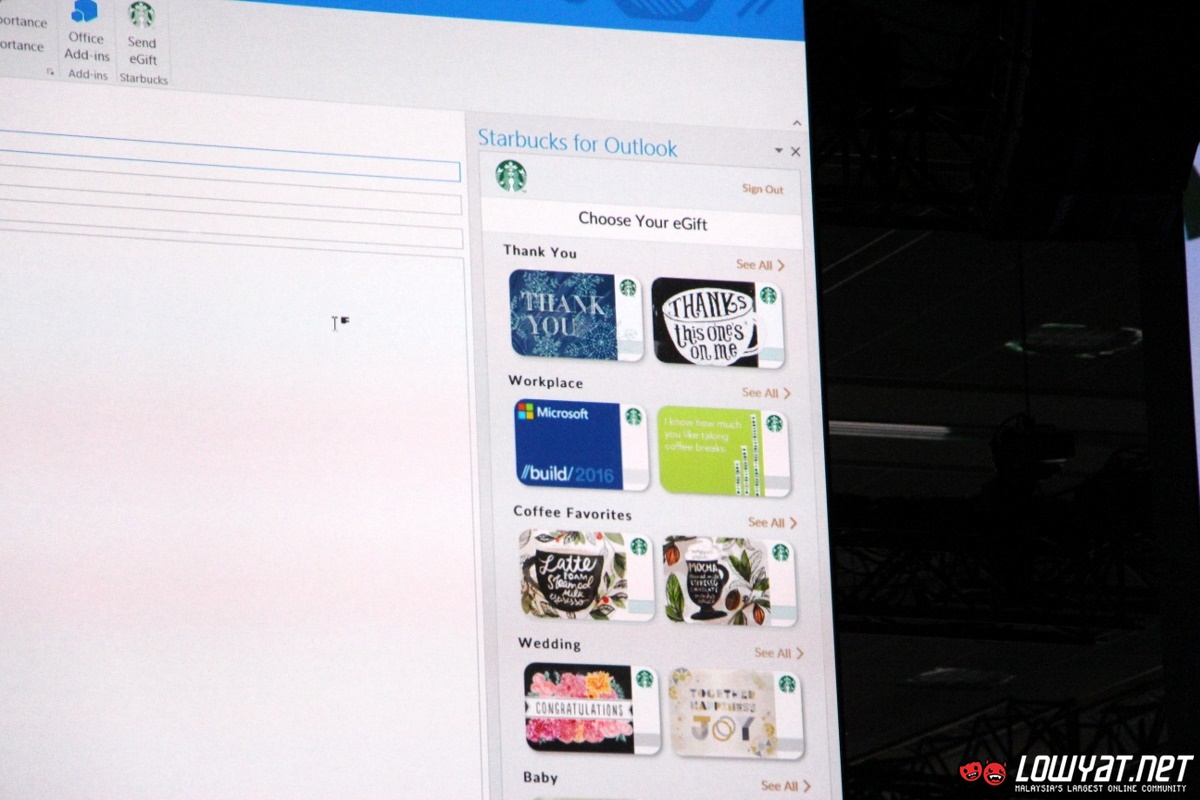 While not shown on stage, Starbucks stated that users will be able to create co-branded Starbucks gift card in the near future too. No exact release date was mentioned though and I doubt that it can be used in Malaysia since Starbucks Malaysia ecosystem are not tied to its US counterpart but nevertheless, the demo not only shows how the Office add-ins are able to enhance users experience but also opportunities within Office ecosystem that are available for developers.
