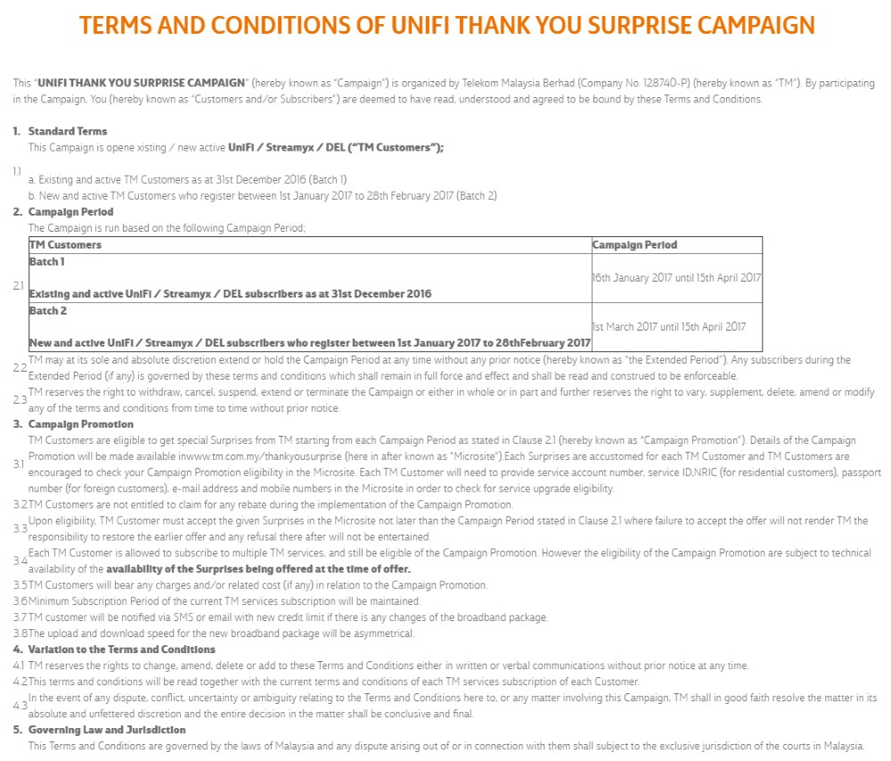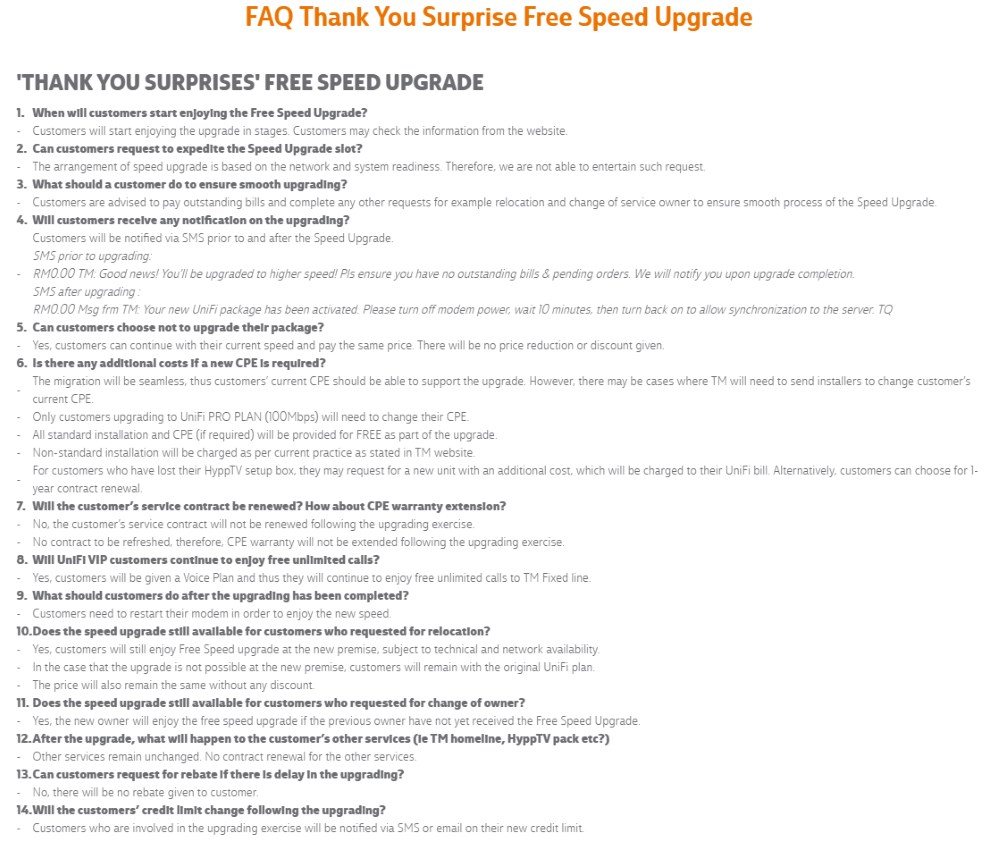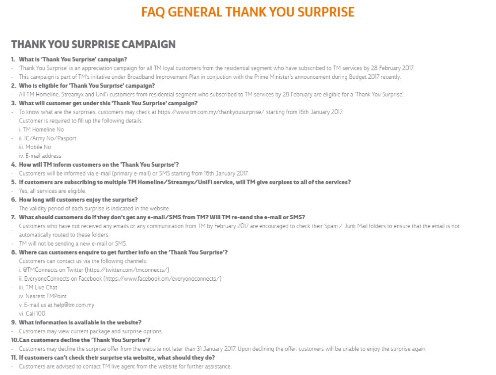 As for when exactly the speed upgrade will take place, the website stated that it will take place anytime between January and June 2017 as the process will be done in stages. For benefit of everyone, you can check out the FAQs as well as the TnC of the Thank You Surprise campaign below for further information.
