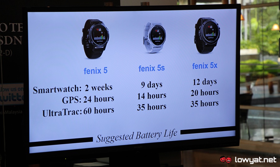 As the lead model in the series, the fēnix 5X does come with a slightly bigger body at 51mm but still features the same 1.2-inch display as per standard fēnix 5. In terms of battery life, the fēnix 5X is able to last up to 12 days in smart mode, 20 hours with GPS/HR, and 35 hours in UltraTrac mode.