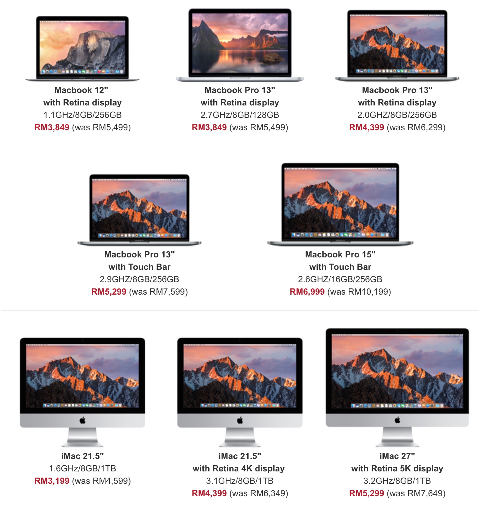 Ex-demo sales include 16GB iPhone 6s Plus for RM1,699 (was RM3,099), 32GB iPhone 7 for RM2,699 (was RM3,199), 12.9” 32GB iPad Pro WiFi for RM2,499 (was RM3,400), 12” MacBook for RM3,849 (was RM5,499), 27” iMac with Retina 5K display for RM5,299 (was RM7,649), and many more.