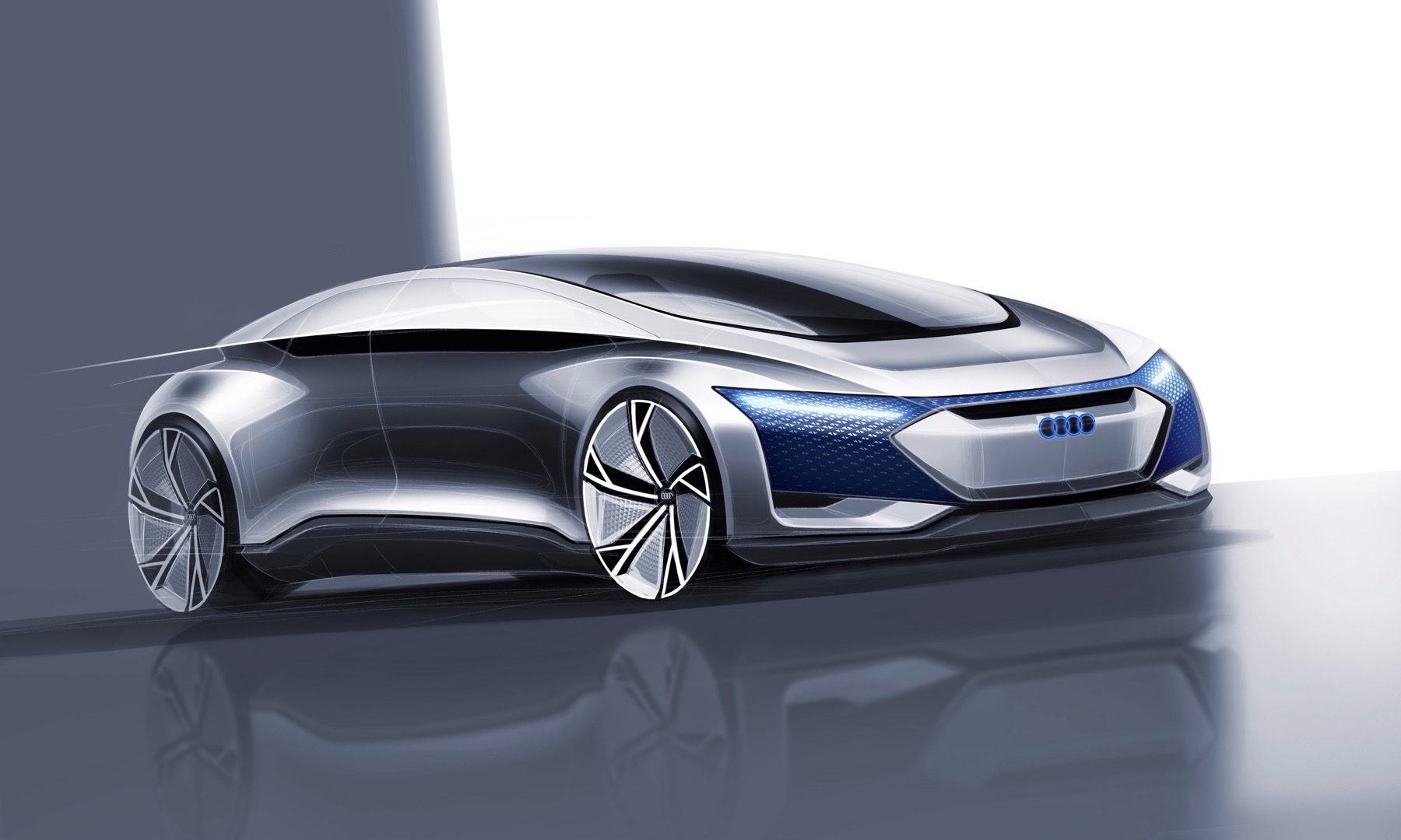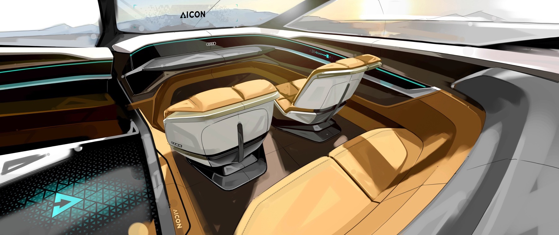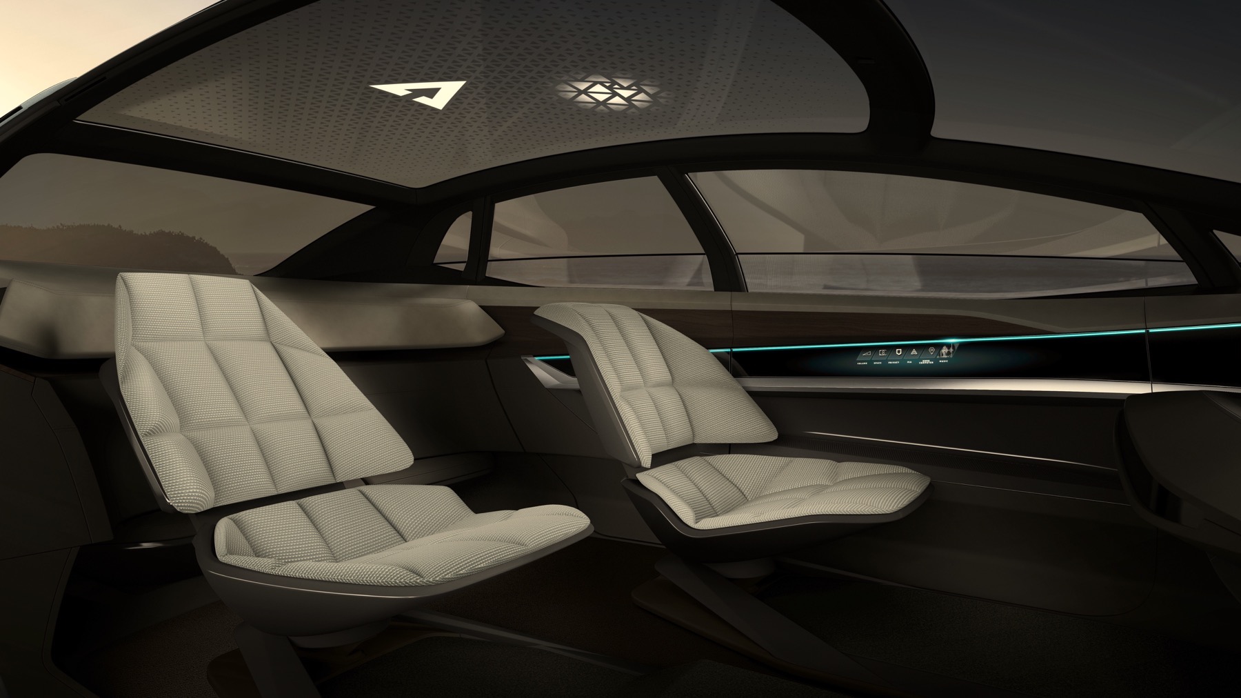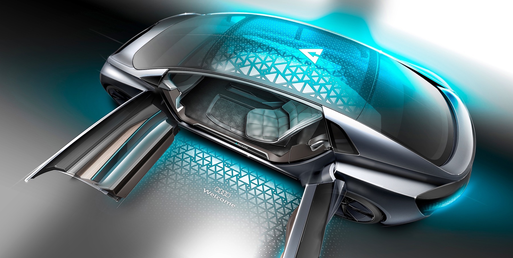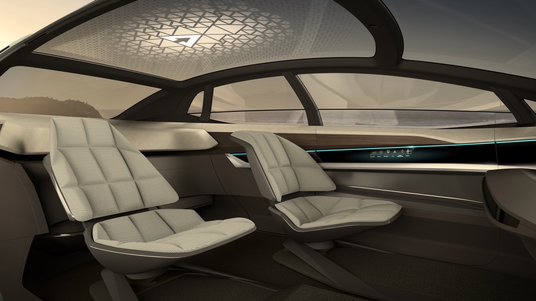 The Audi Aicon features opposed doors that open to the front and rear. There is no B-pillar. The entire breadth of the interior is thus exposed to the passengers as they get in the car. In the interior, the lines of the decorative surfaces and functional elements are markedly horizontal. Becoming lighter from bottom to top, the interior reinforces the impression of unique spaciousness, and the lack of a steering wheel and a classic dashboard creates a sense of openness and expanse.