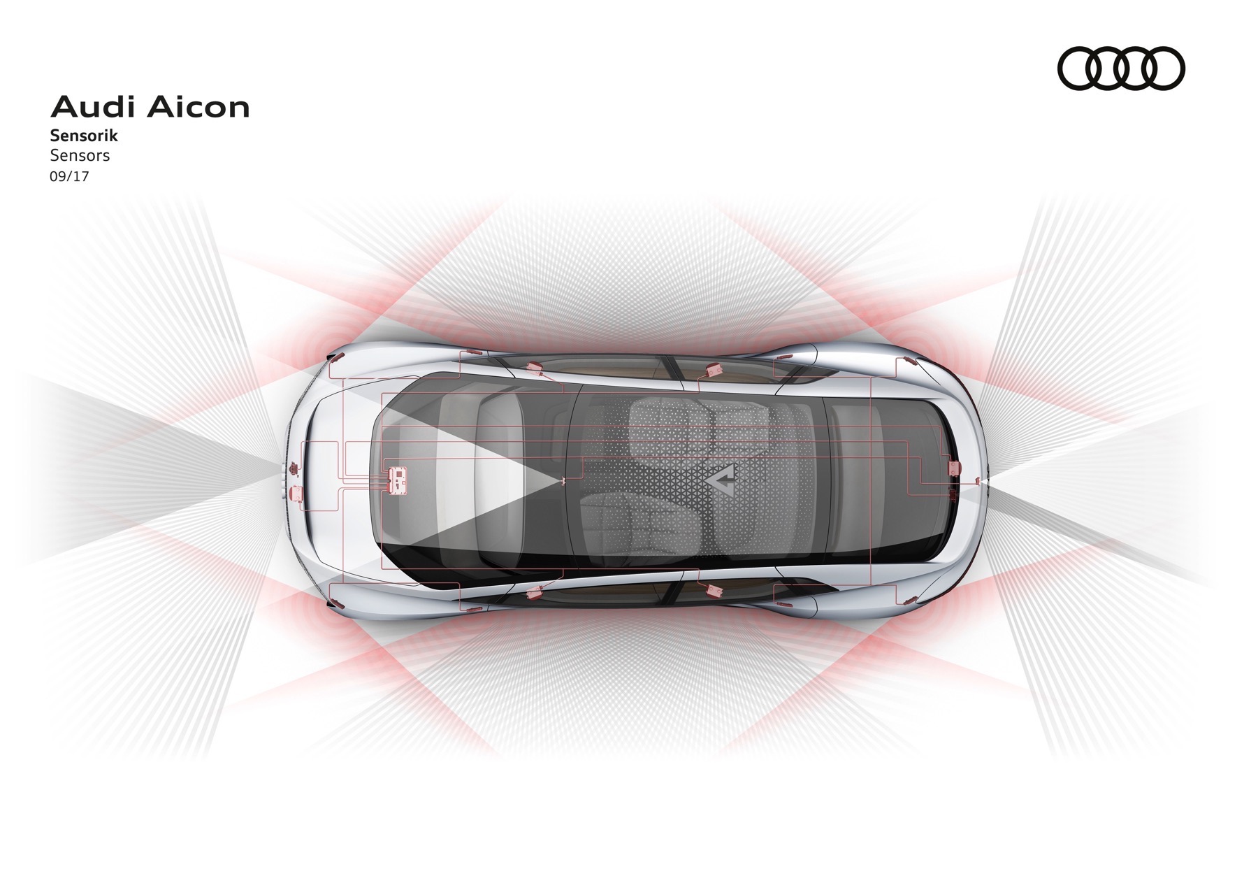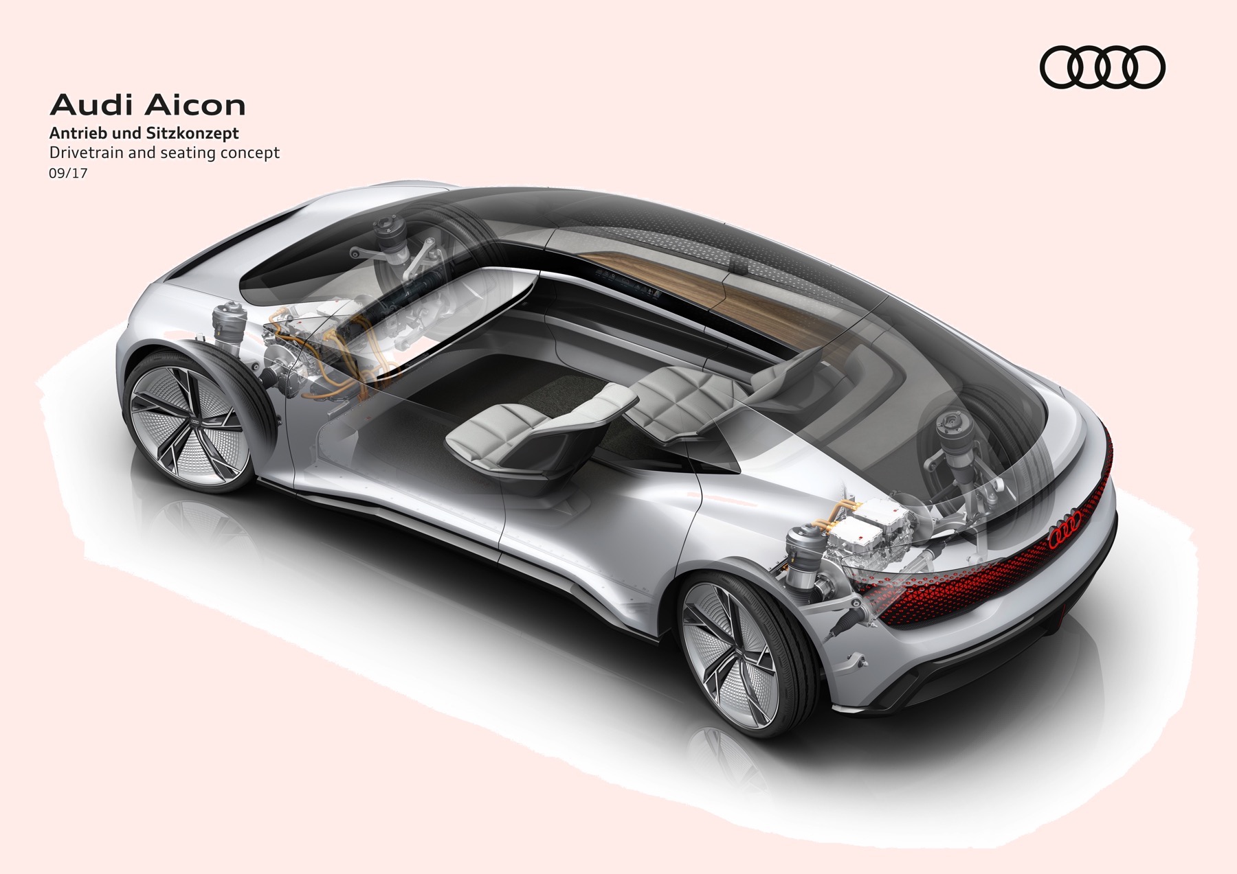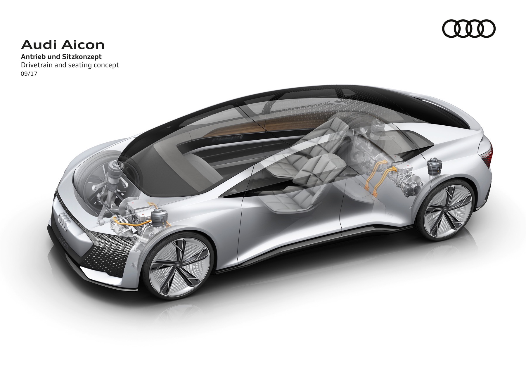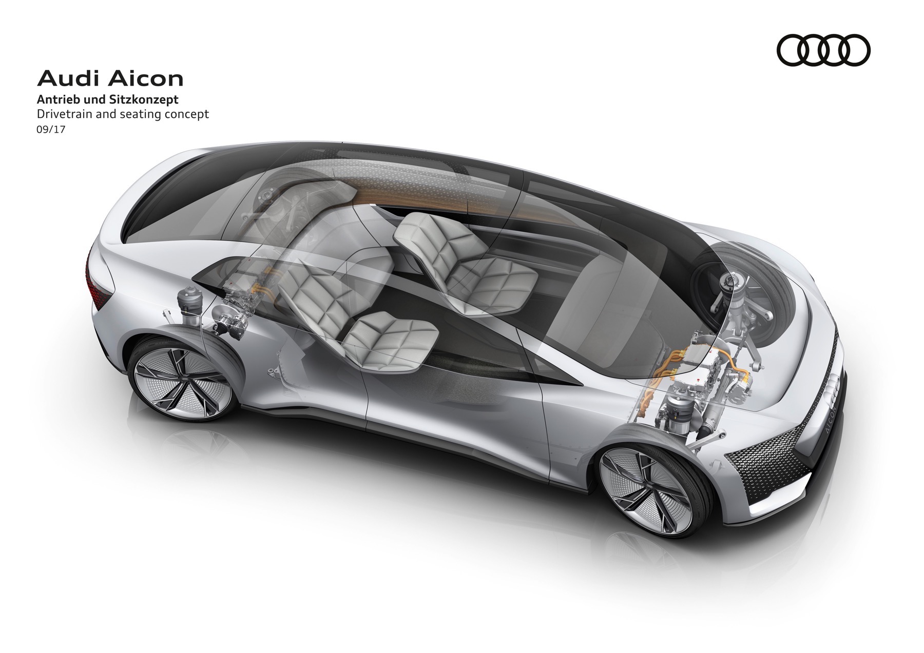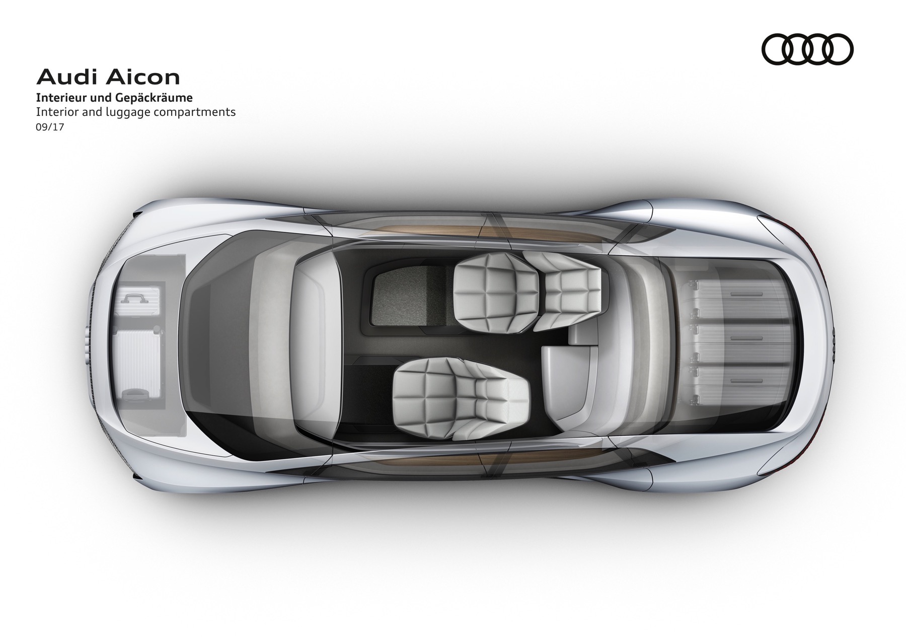 The Audi Aicon features opposed doors that open to the front and rear. There is no B-pillar. The entire breadth of the interior is thus exposed to the passengers as they get in the car. In the interior, the lines of the decorative surfaces and functional elements are markedly horizontal. Becoming lighter from bottom to top, the interior reinforces the impression of unique spaciousness, and the lack of a steering wheel and a classic dashboard creates a sense of openness and expanse.