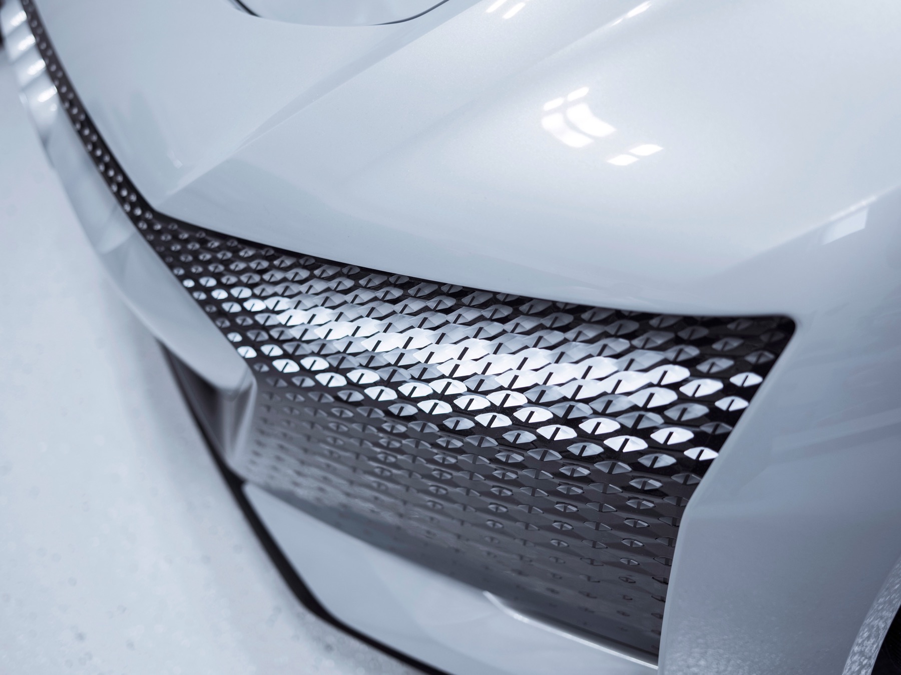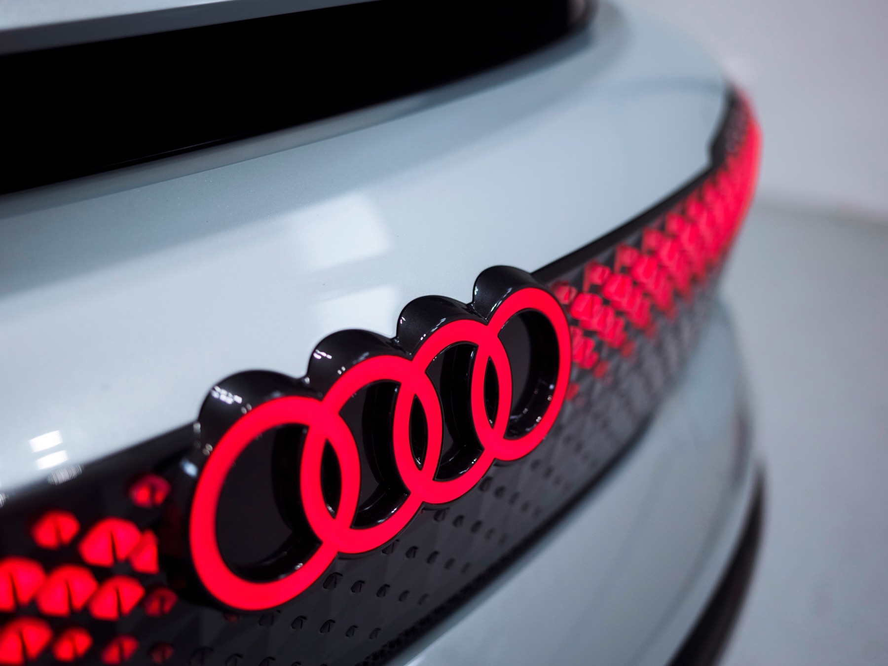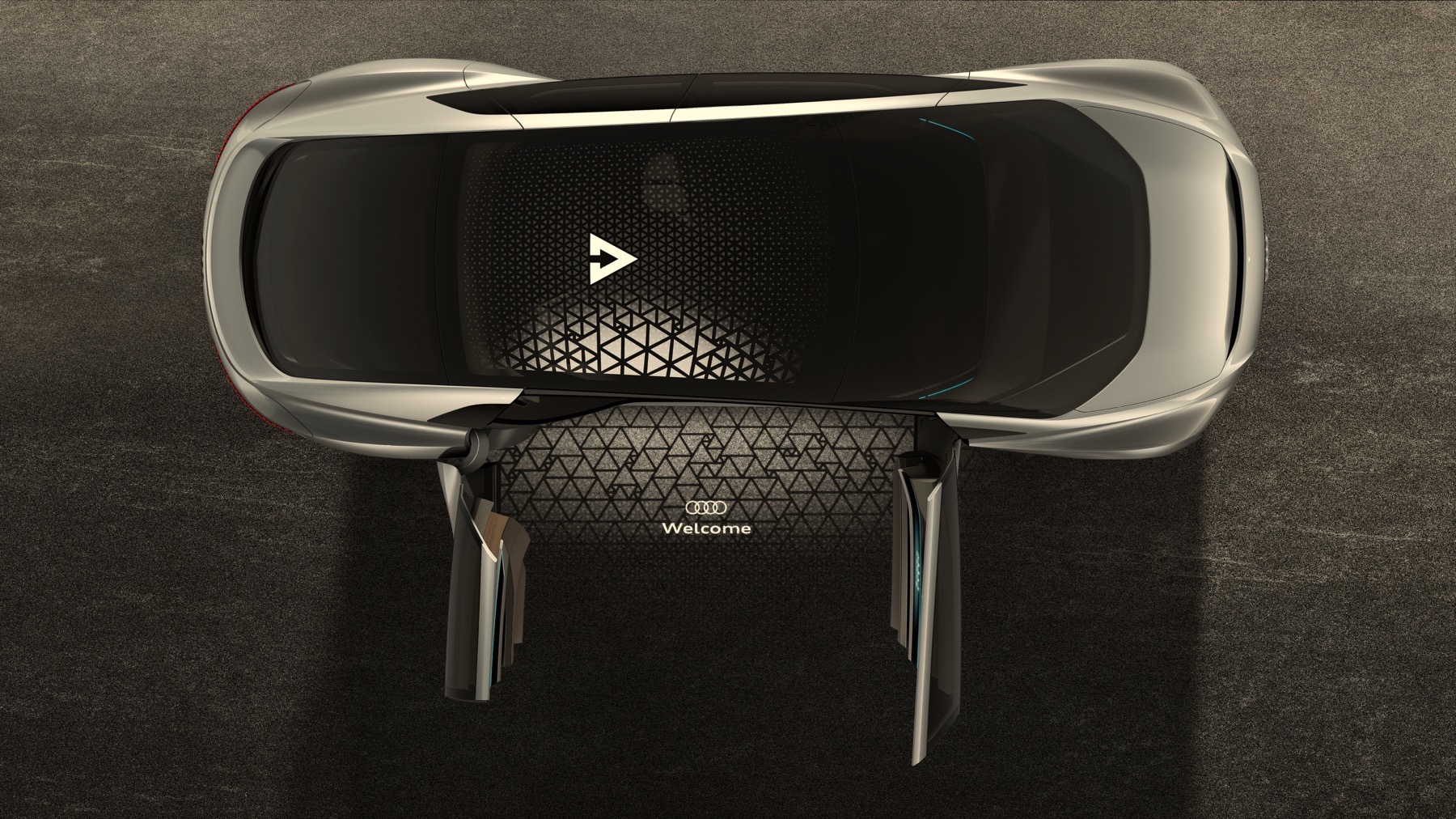 Conventional headlights and lighting units are absent from both the front and rear of this car. Instead there are fully digital display surfaces comprising hundreds of triangular pixel segments. They are three-dimensional recreations of the Audi AI symbol.