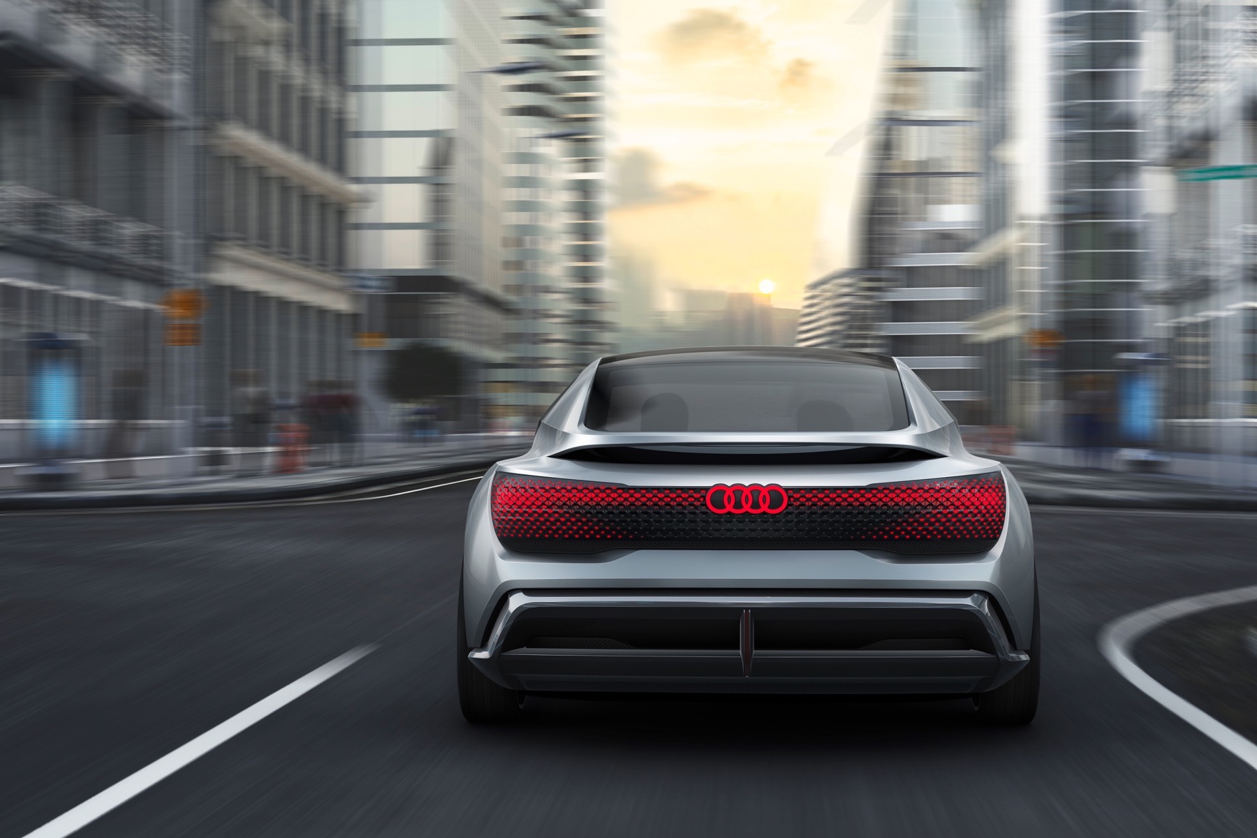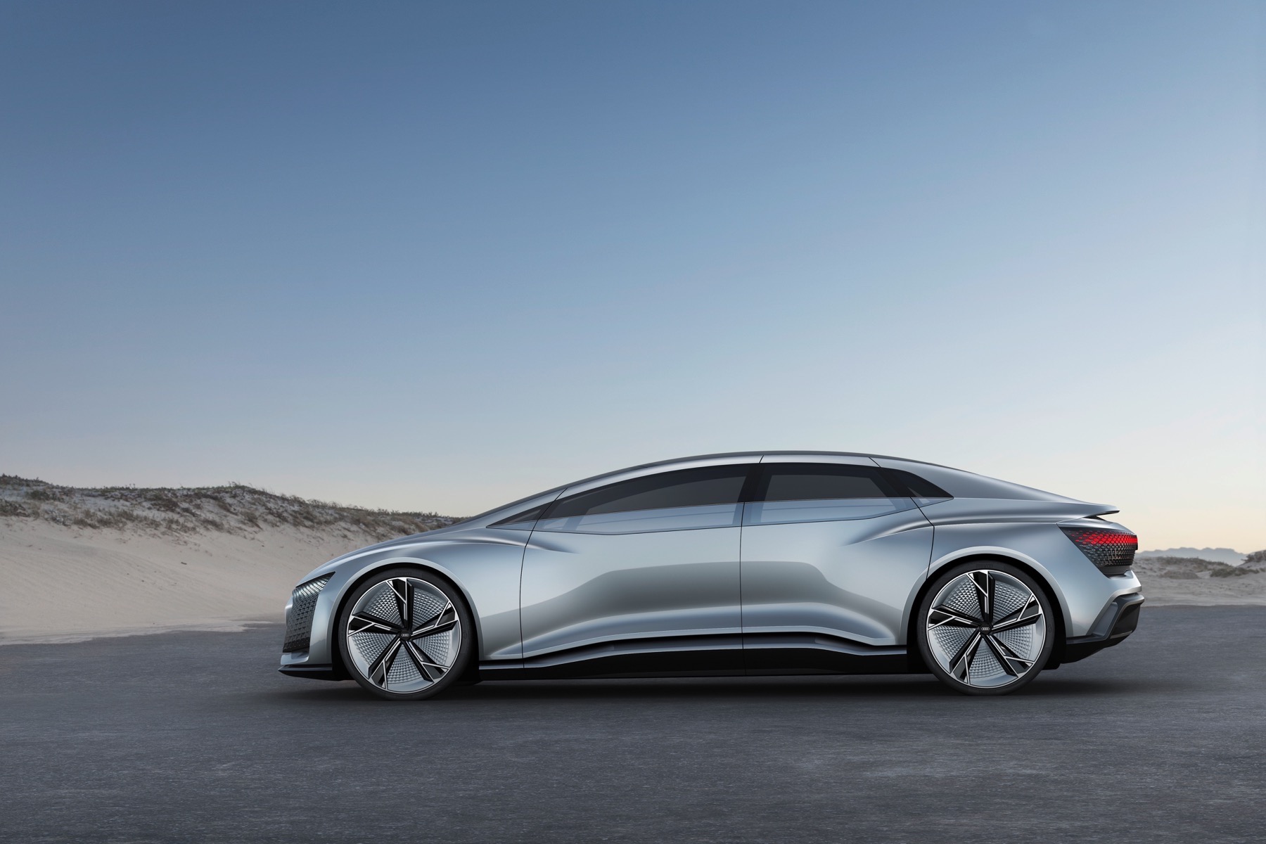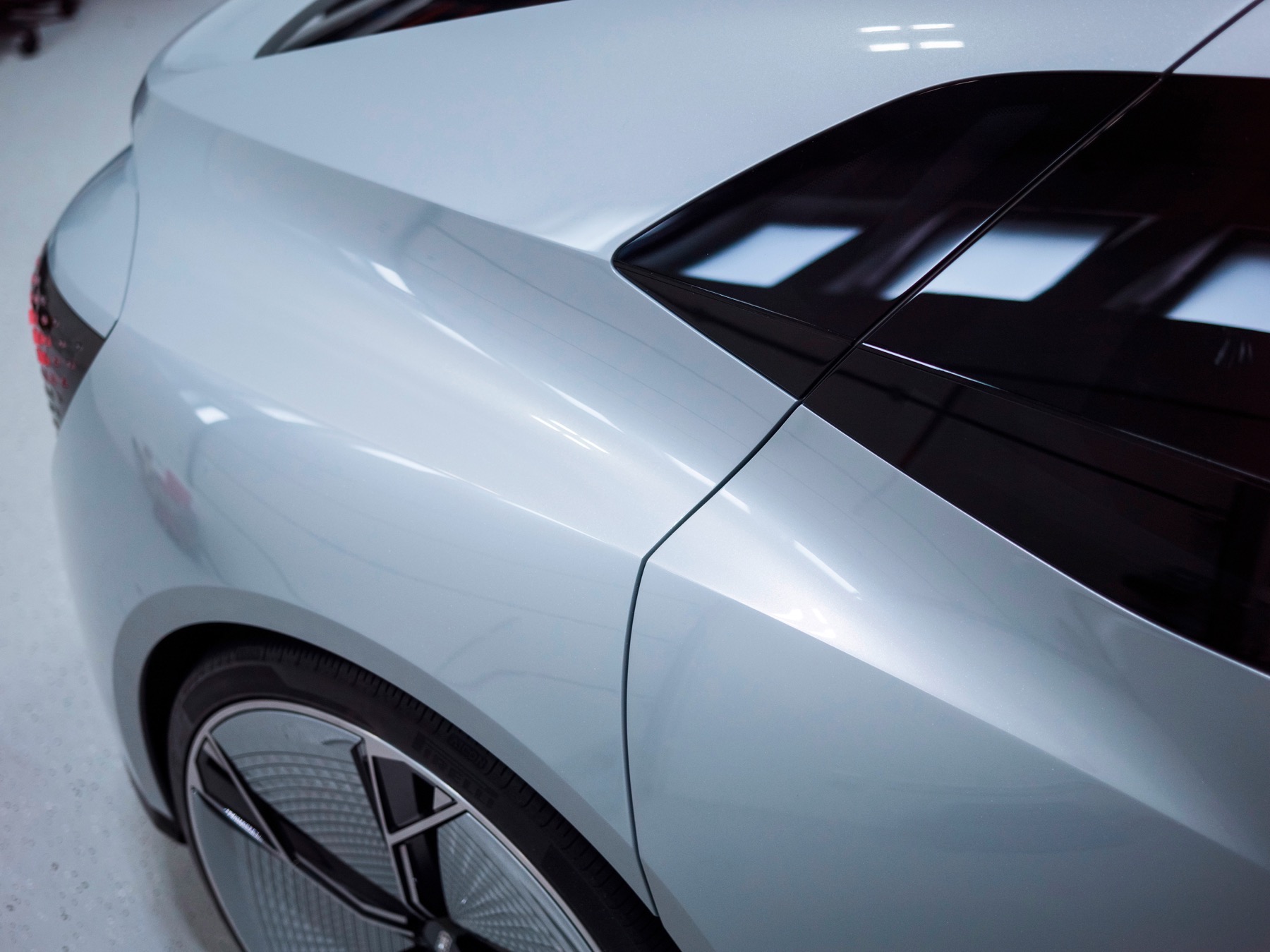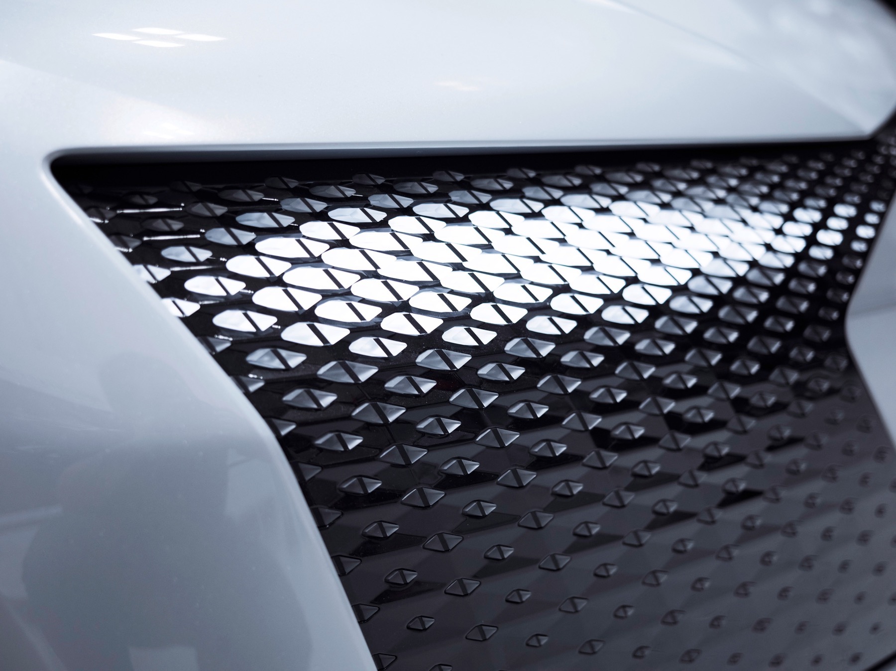 Conventional headlights and lighting units are absent from both the front and rear of this car. Instead there are fully digital display surfaces comprising hundreds of triangular pixel segments. They are three-dimensional recreations of the Audi AI symbol.