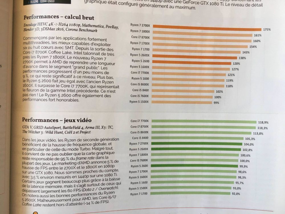 Official benchmark results of the AMD Ryzen 7 2700X have appeared in French tech magazine, CPC Hardware. The pages show a CPU that is about on par with the Ryzen 7 1800X in terms of gaming performance, but far ahead in synthetic tests.