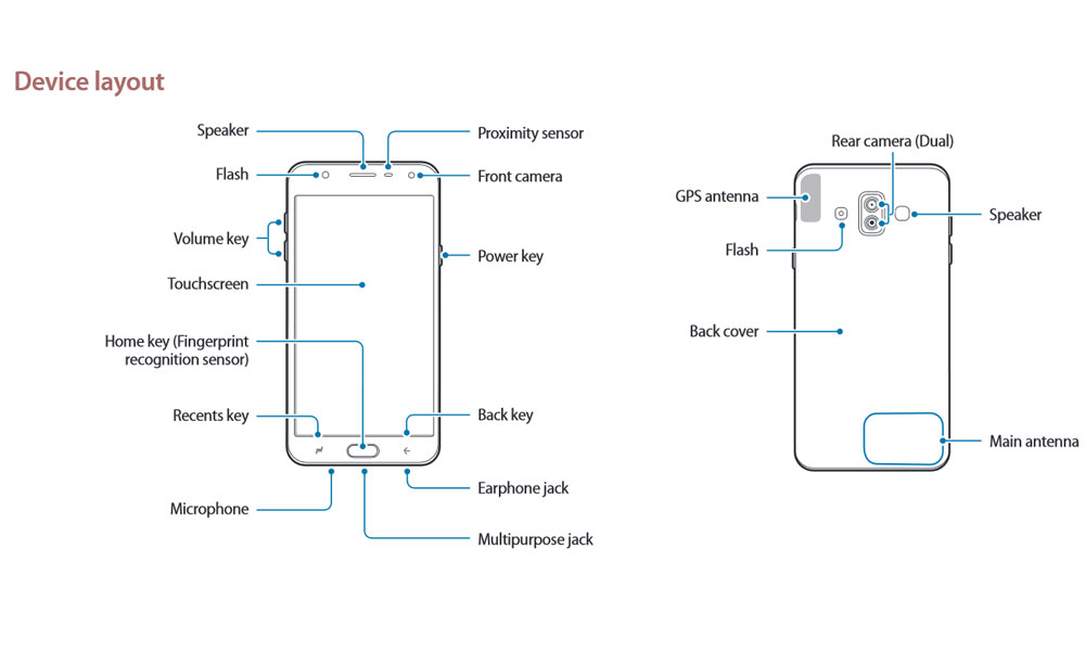 According to the manual, the Samsung Galaxy J7 Duo 2018 will use microSIM rather than the nanoSIM standard. It will also have a microUSB port rather than Type-C, with no fast charging support mentioned. There is also a front-mounted fingerprint scanner for biometric security and Samsung Pay Mini authentication.