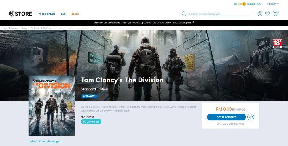 Earlier in the year, Ubisoft sold Tom Clancy’s The Division 2 at a very low price of RM10. Now, the publisher is giving away its predecessor for free on Uplay. You can claim it for absolutely no charge up until 10AM of 8 September 2020.