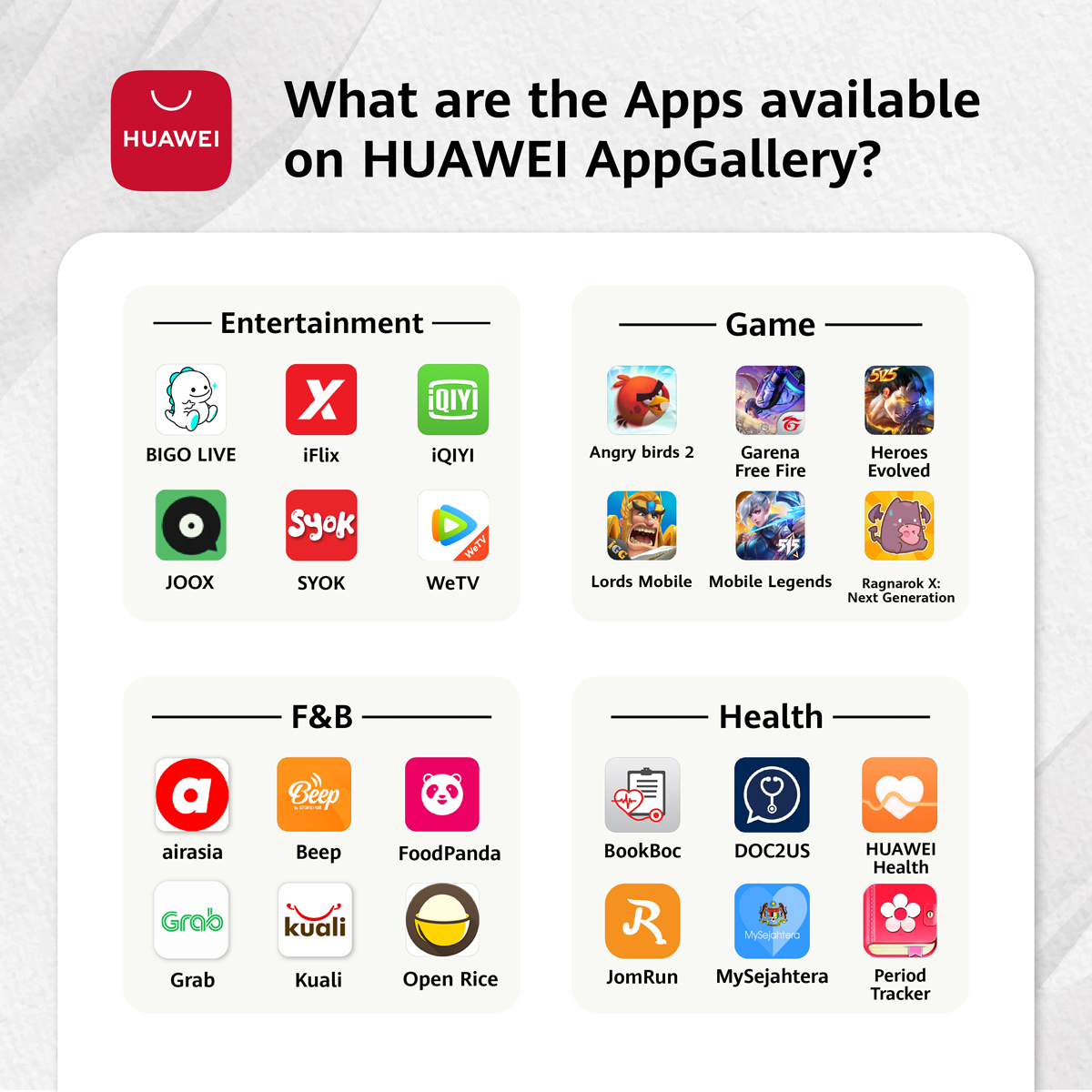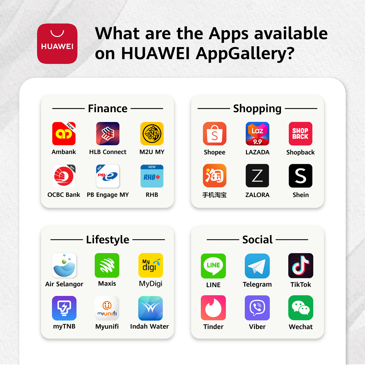 Keep your Huawei device up to date with the latest communications software such as Zoom, Telegram and Wechat; e-commerce apps including Lazada and Shopee; local cashless payment platforms such as Touch ‘n Go eWallet, Boost, and Setel; as well as mobile banking apps by Maybank, CIMB, Hong Leong, and so much more!