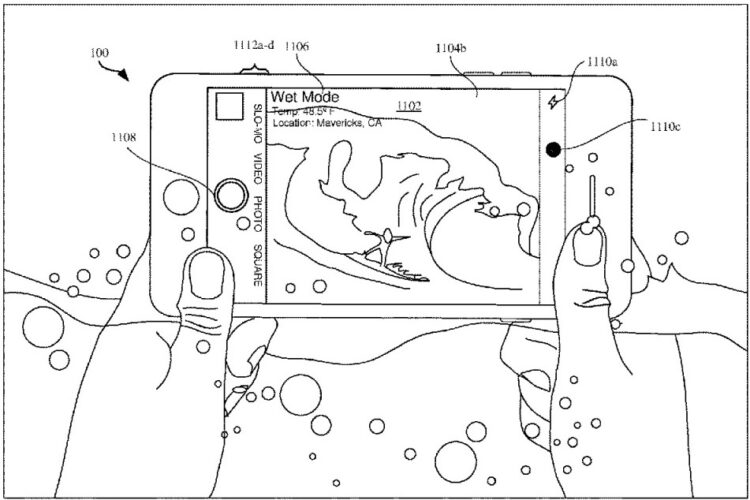 Beyond the extra protective layer, the Apple patent also specifically mentions a “submerged moisture event”. This involves enlarging commonly used icons, as well as optimising camera and video settings, for underwater photography.