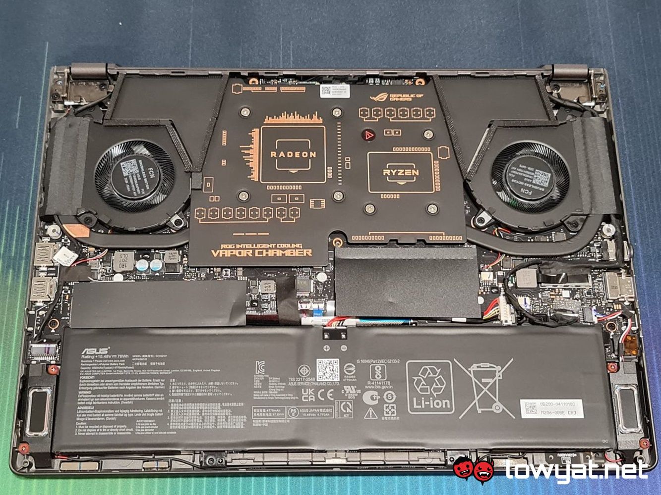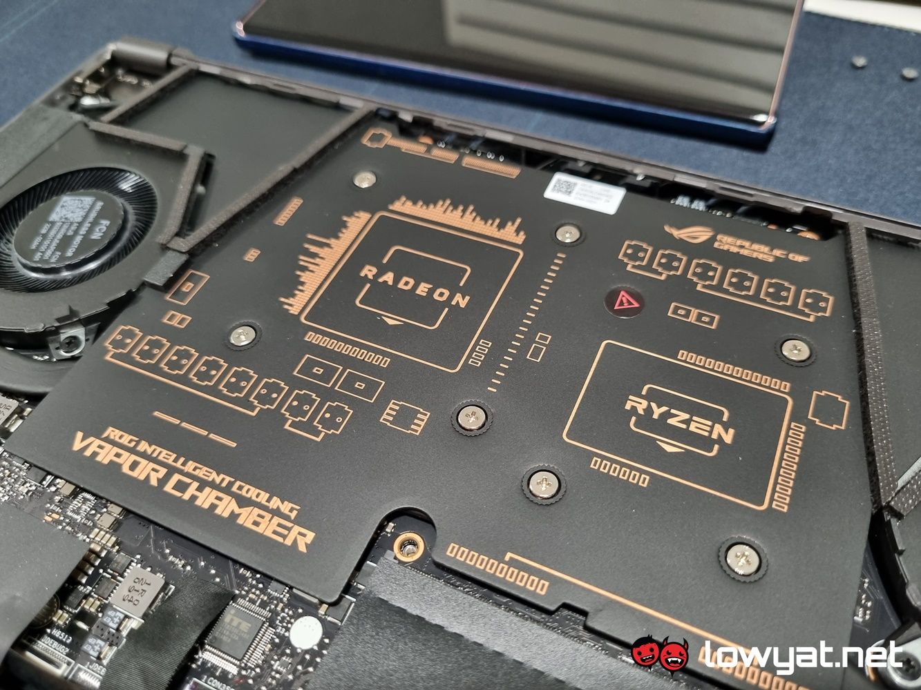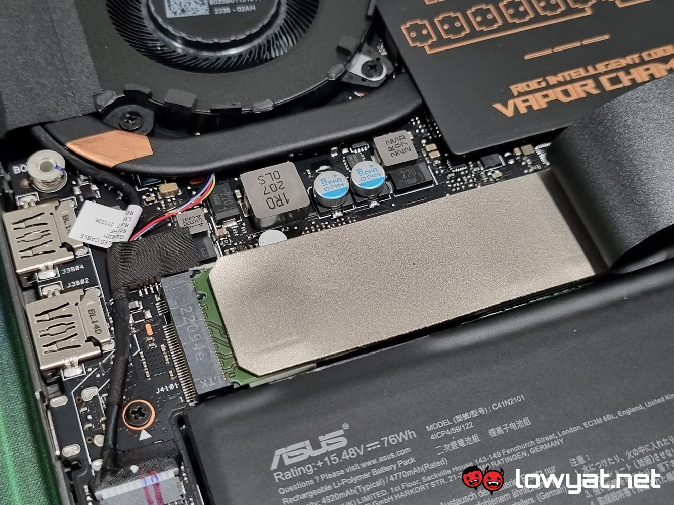 Underneath the hood of the G14 2022, you can see where ASUS actually tidied up on its compartmentalisation skills. Both the AMD Ryzen CPU and Radeon GPU sit right in the upper middle section, their location marked by the Taiwanese brand’s own Vapour Chamber cooling technology sitting on top of them. For those wondering why I didn’t disassemble the heatsink, it’s because the components in question are coated with Thermal Grizzly’s liquid metal compound, and I didn’t have said material on-site at the time.