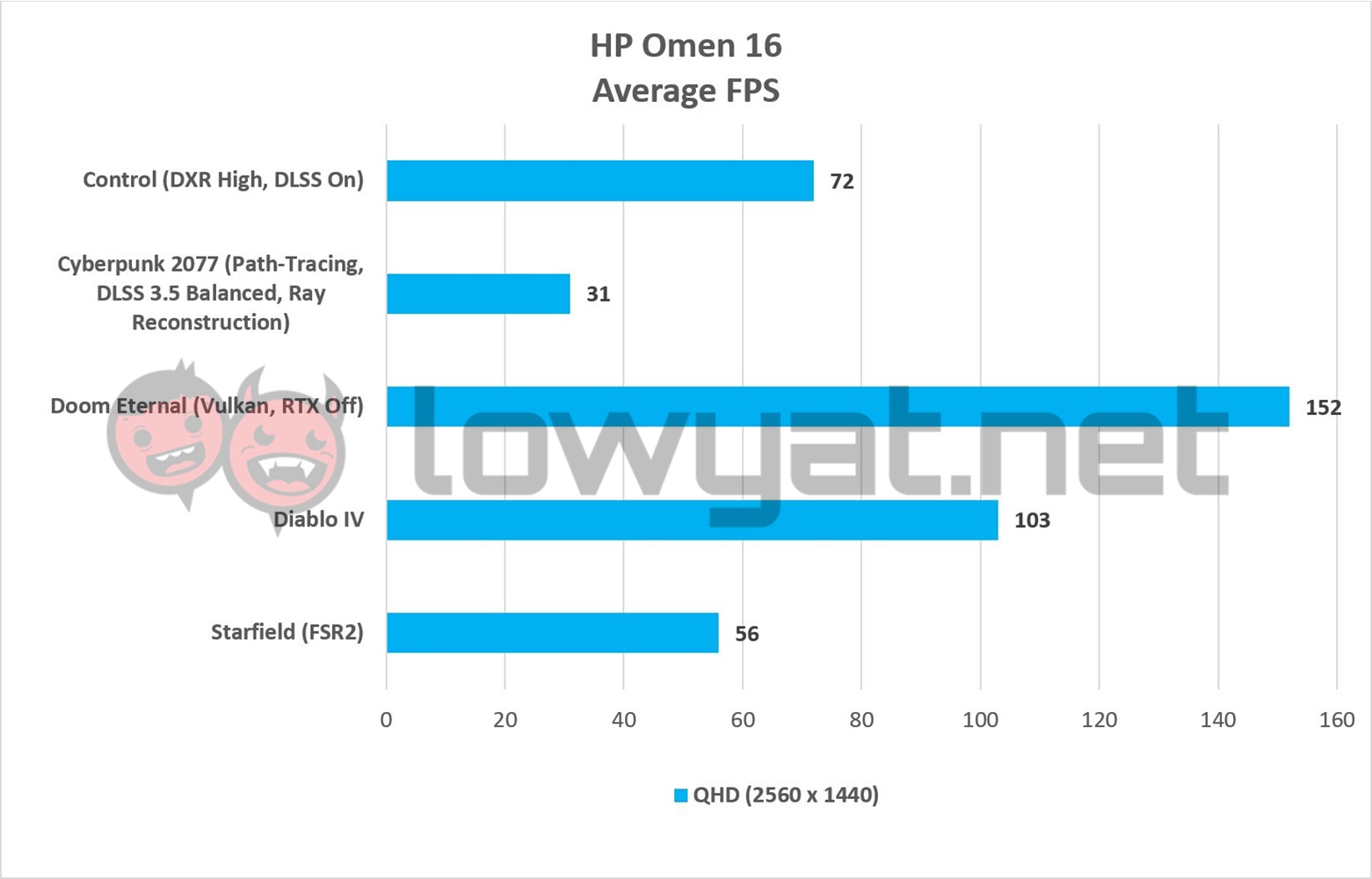 Despite its 16.1-inch panel, the Omen 16’s display isn’t a 16:10 but 16:9, not that there is anything wrong with that. The viewing experience is actually pretty solid: the colour palette feels a little more saturated than I like but on the upside, visuals are crisp and sharp, and with that 140W RTX 4070 inside, all my games ran at comfortable average frame rates above the 45 fps mark.