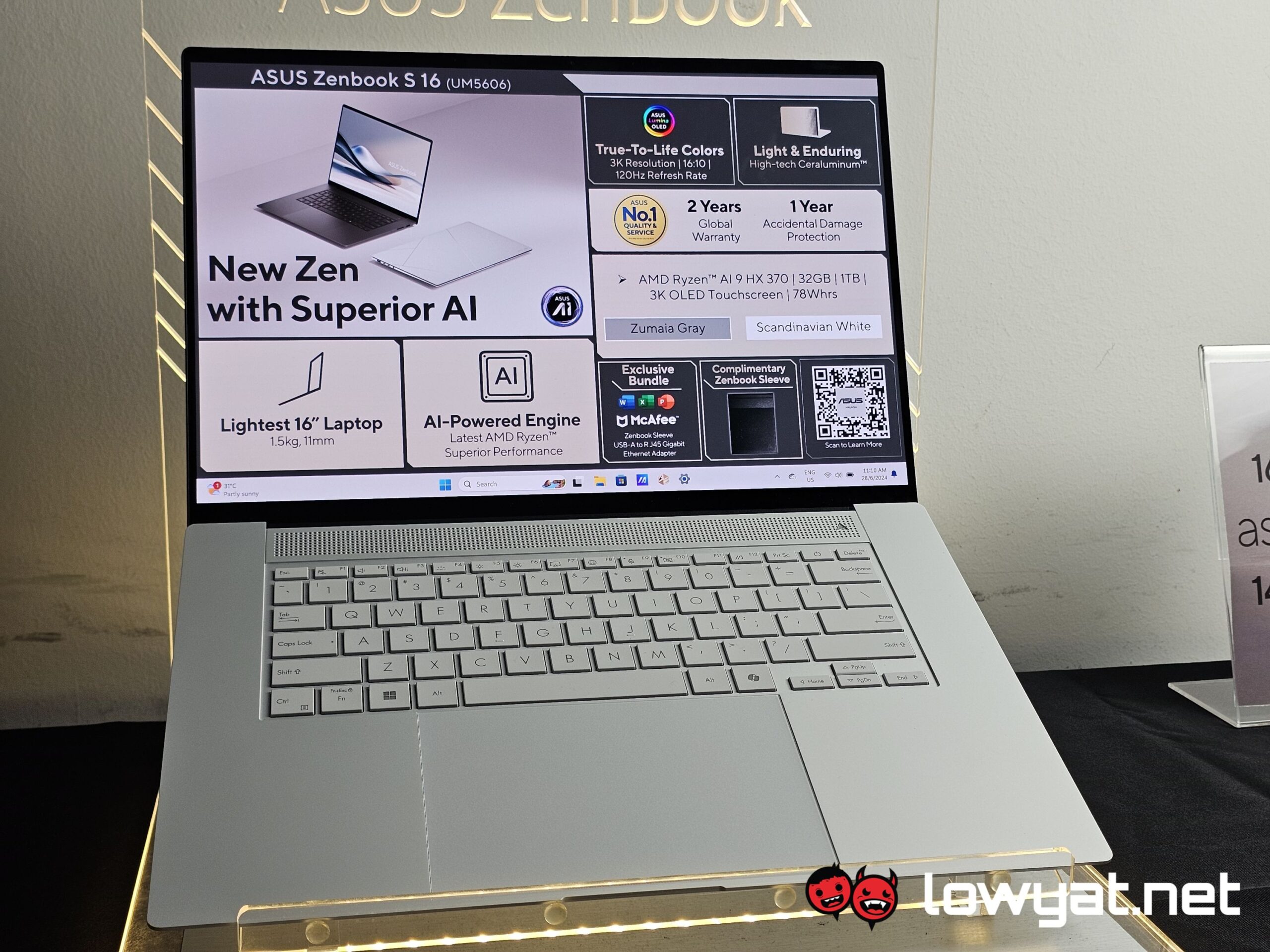Just as how the Vivobook S 15 is the first Copilot+ PC powered by Qualcomm’s Snapdragon X Series processors, the ZenBook S 16 is the brand’s first non-gaming laptop to be fitted with AMD’s latest Strix Point CPU, the Ryzen AI 9 370HX. In terms of performance, the CPU is based on the new Zen5 architecture and sports 12-cores, 24-threads. Additionally, the CPU also comes with an XDNA2 NPU that peaks at 50 TOPS, and an integrated RDNA3.5 Radeon 890M GPU with 16 Compute Units (CUs).