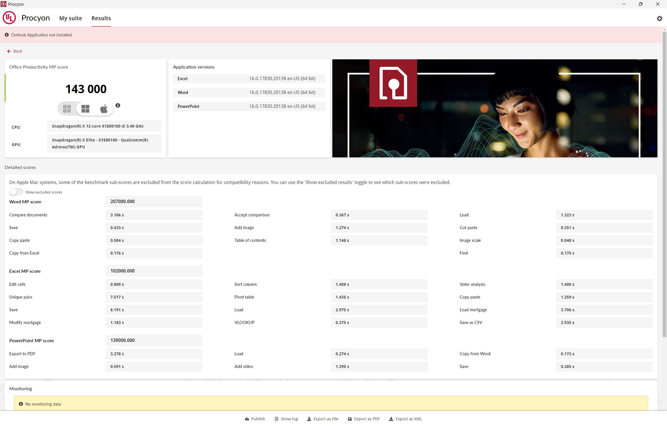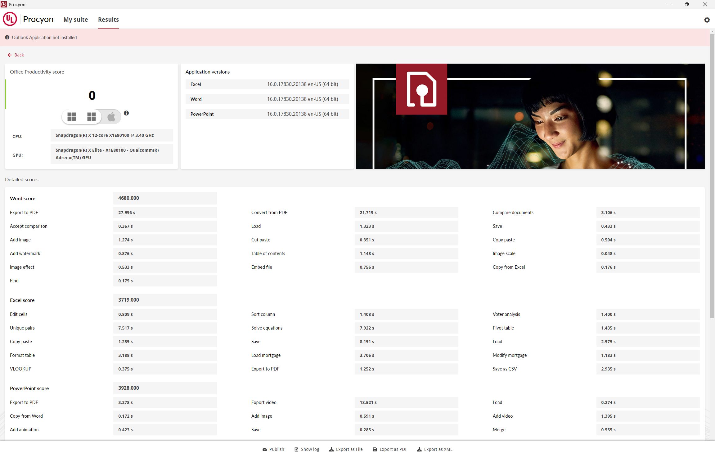 As for tests for the Hexagon NPU, I did use UL’s Procyon and its Productivity test but even then, it wasn’t able to give me a Windows-to-Windows score, all because the system was unable to load up one of the Microsoft 365 apps, Outlook. You know, Outlook.
